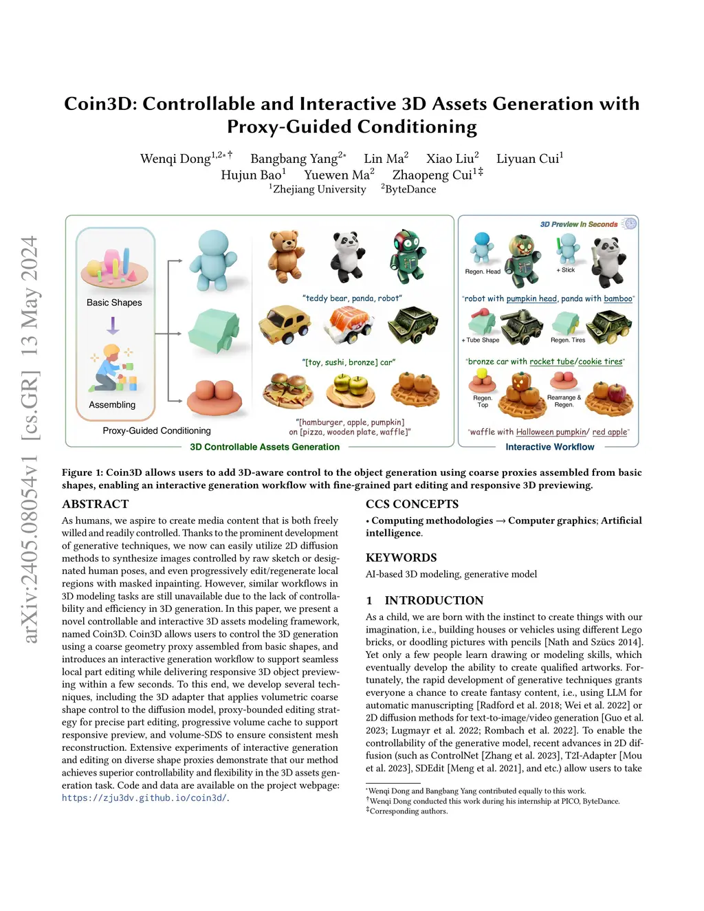 As humans, we aspire to create media content that is both freely willed and readily controlled. Thanks to the prominent development of generative techniques, we now can easily utilize 2D diffusion methods to synthesize images controlled by raw sketch or designated human poses, and even progressively edit/regenerate local regions with masked inpainting. However, similar workflows in 3D modeling tasks are still unavailable due to the lack of controllability and efficiency in 3D generation. In this paper, we present a novel controllable and interactive 3D assets modeling framework, named Coin3D. Coin3D allows users to control the 3D generation using a coarse geometry proxy assembled from basic shapes, and introduces an interactive generation workflow to support seamless local part editing while delivering responsive 3D object previewing within a few seconds. To this end, we develop several techniques, including the 3D adapter that applies volumetric coarse shape control to the diffusion model, proxy-bounded editing strategy for precise part editing, progressive volume cache to support responsive preview, and volume-SDS to ensure consistent mesh reconstruction. Extensive experiments of interactive generation and editing on diverse shape proxies demonstrate that our method achieves superior controllability and flexibility in the 3D assets generation task.