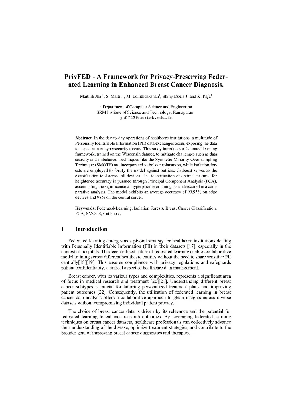 In the day-to-day operations of healthcare institutions, a multitude of Personally Identifiable Information (PII) data exchanges occur, exposing the data to a spectrum of cybersecurity threats. This study introduces a federated learning framework, trained on the Wisconsin dataset, to mitigate challenges such as data scarcity and imbalance. Techniques like the Synthetic Minority Over-sampling Technique (SMOTE) are incorporated to bolster robustness, while isolation forests are employed to fortify the model against outliers. Catboost serves as the classification tool across all devices. The identification of optimal features for heightened accuracy is pursued through Principal Component Analysis (PCA),accentuating the significance of hyperparameter tuning, as underscored in a comparative analysis. The model exhibits an average accuracy of 99.95% on edge devices and 98% on the central server.