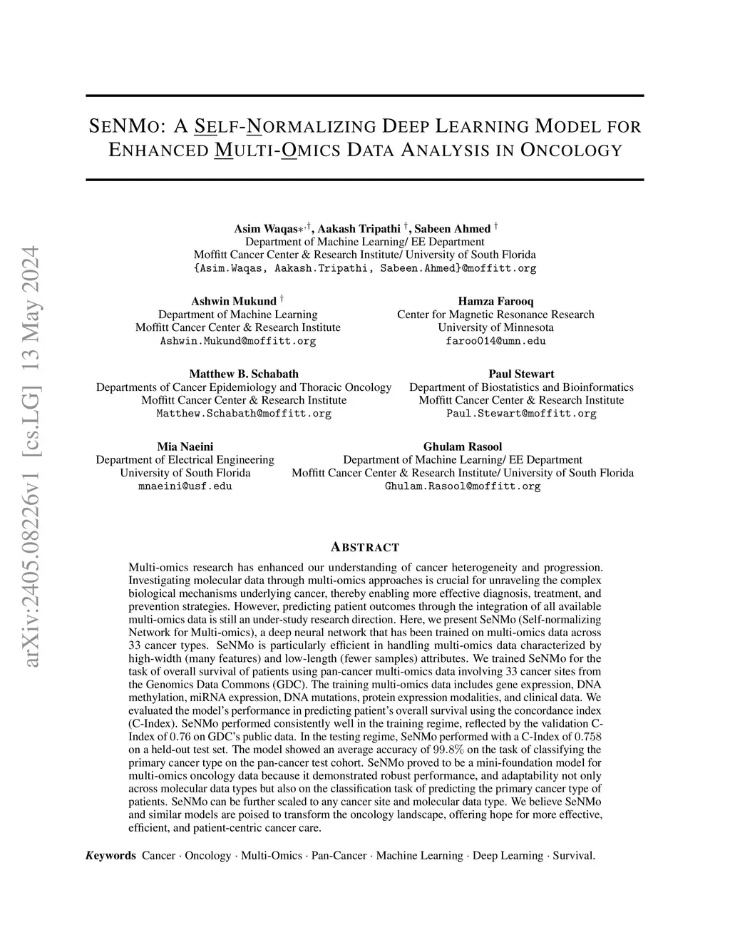 Multi-omics research has enhanced our understanding of cancer heterogeneity and progression. Investigating molecular data through multi-omics approaches is crucial for unraveling the complex biological mechanisms underlying cancer, thereby enabling effective diagnosis, treatment, and prevention strategies. However, predicting patient outcomes through integration of all available multi-omics data is an under-study research direction. Here, we present SeNMo (Self-normalizing Network for Multi-omics), a deep neural network trained on multi-omics data across 33 cancer types. SeNMo is efficient in handling multi-omics data characterized by high-width (many features) and low-length (fewer samples) attributes. We trained SeNMo for the task of overall survival using pan-cancer data involving 33 cancer sites from Genomics Data Commons (GDC). The training data includes gene expression, DNA methylation, miRNA expression, DNA mutations, protein expression modalities, and clinical data. We evaluated the model's performance in predicting overall survival using concordance index (C-Index). SeNMo performed consistently well in training regime, with the validation C-Index of 0.76 on GDC's public data. In the testing regime, SeNMo performed with a C-Index of 0.758 on a held-out test set. The model showed an average accuracy of 99.8% on the task of classifying the primary cancer type on the pan-cancer test cohort. SeNMo proved to be a mini-foundation model for multi-omics oncology data because it demonstrated robust performance, and adaptability not only across molecular data types but also on the classification task of predicting the primary cancer type of patients. SeNMo can be further scaled to any cancer site and molecular data type. We believe SeNMo and similar models are poised to transform the oncology landscape, offering hope for more effective, efficient, and patient-centric cancer care.