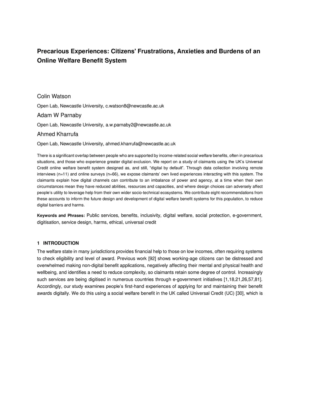 There is a significant overlap between people who are supported by income-related social welfare benefits, often in precarious situations, and those who experience greater digital exclusion. We report on a study of claimants using the UK's Universal Credit online welfare benefit system designed as, and still, "digital by default". Through data collection involving remote interviews (n=11) and online surveys (n=66), we expose claimants' own lived experiences interacting with this system. The claimants explain how digital channels can contribute to an imbalance of power and agency, at a time when their own circumstances mean they have reduced abilities, resources and capacities, and where design choices can adversely affect people's utility to leverage help from their own wider socio-technical ecosystems. We contribute eight recommendations from these accounts to inform the future design and development of digital welfare benefit systems for this population, to reduce digital barriers and harms.
