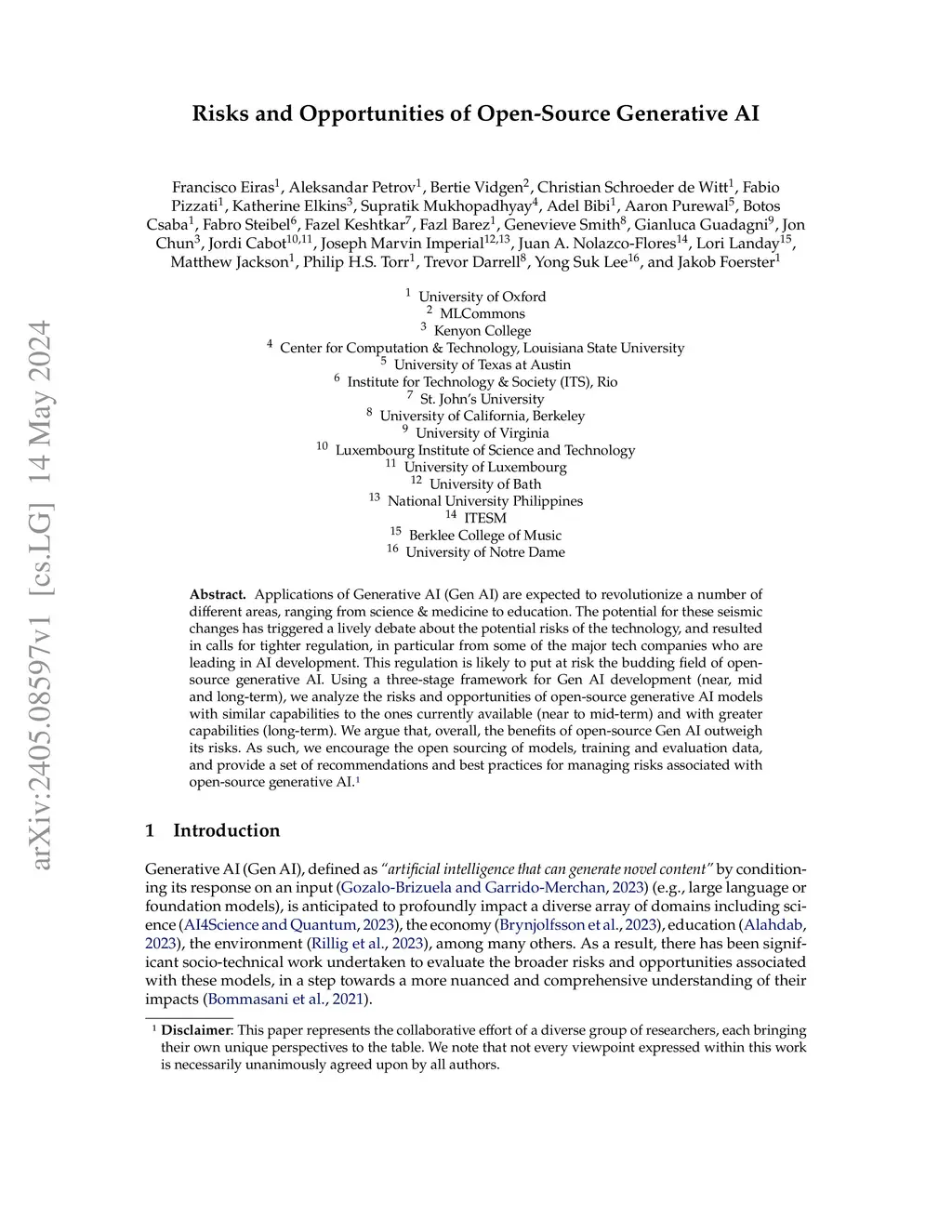 Applications of Generative AI (Gen AI) are expected to revolutionize a number of different areas, ranging from science & medicine to education. The potential for these seismic changes has triggered a lively debate about the potential risks of the technology, and resulted in calls for tighter regulation, in particular from some of the major tech companies who are leading in AI development. This regulation is likely to put at risk the budding field of open-source generative AI. Using a three-stage framework for Gen AI development (near, mid and long-term), we analyze the risks and opportunities of open-source generative AI models with similar capabilities to the ones currently available (near to mid-term) and with greater capabilities (long-term). We argue that, overall, the benefits of open-source Gen AI outweigh its risks. As such, we encourage the open sourcing of models, training and evaluation data, and provide a set of recommendations and best practices for managing risks associated with open-source generative AI.