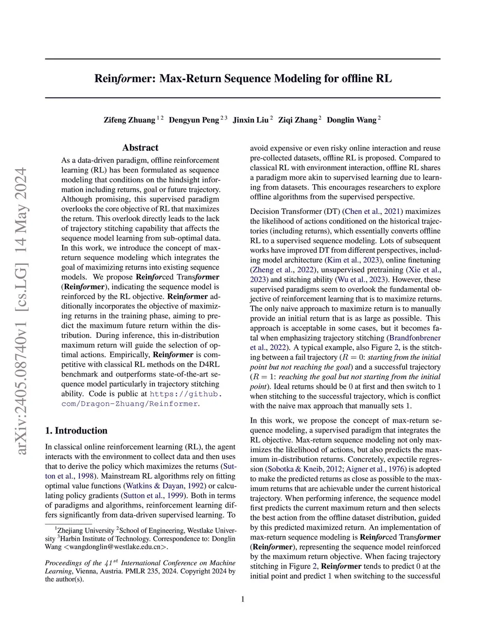 As a data-driven paradigm, offline reinforcement learning (RL) has been formulated as sequence modeling that conditions on the hindsight information including returns, goal or future trajectory. Although promising, this supervised paradigm overlooks the core objective of RL that maximizes the return. This overlook directly leads to the lack of trajectory stitching capability that affects the sequence model learning from sub-optimal data. In this work, we introduce the concept of max-return sequence modeling which integrates the goal of maximizing returns into existing sequence models. We propose Reinforced Transformer (Reinformer), indicating the sequence model is reinforced by the RL objective. Reinformer additionally incorporates the objective of maximizing returns in the training phase, aiming to predict the maximum future return within the distribution. During inference, this in-distribution maximum return will guide the selection of optimal actions. Empirically, Reinformer is competitive with classical RL methods on the D4RL benchmark and outperforms state-of-the-art sequence model particularly in trajectory stitching ability. Code is public at https://github.com/Dragon-Zhuang/Reinformer.