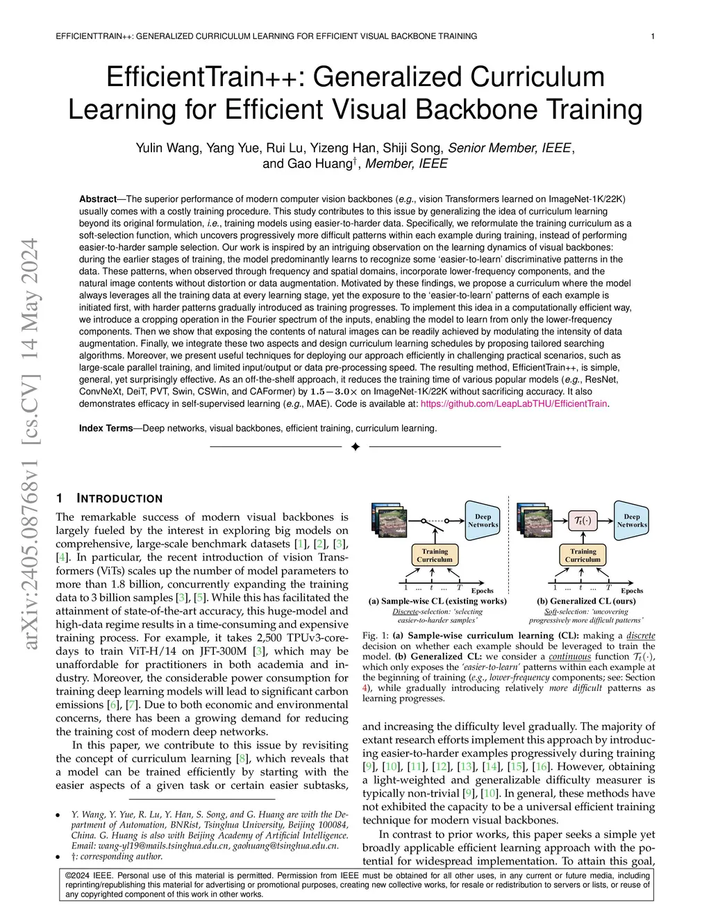 The superior performance of modern visual backbones usually comes with a costly training procedure. We contribute to this issue by generalizing the idea of curriculum learning beyond its original formulation, i.e., training models using easier-to-harder data. Specifically, we reformulate the training curriculum as a soft-selection function, which uncovers progressively more difficult patterns within each example during training, instead of performing easier-to-harder sample selection. Our work is inspired by an intriguing observation on the learning dynamics of visual backbones: during the earlier stages of training, the model predominantly learns to recognize some éasier-to-learn' discriminative patterns in the data. These patterns, when observed through frequency and spatial domains, incorporate lower-frequency components, and the natural image contents without distortion or data augmentation. Motivated by these findings, we propose a curriculum where the model always leverages all the training data at every learning stage, yet the exposure to the éasier-to-learn' patterns of each example is initiated first, with harder patterns gradually introduced as training progresses. To implement this idea in a computationally efficient way, we introduce a cropping operation in the Fourier spectrum of the inputs, enabling the model to learn from only the lower-frequency components. Then we show that exposing the contents of natural images can be readily achieved by modulating the intensity of data augmentation. Finally, we integrate these aspects and design curriculum schedules with tailored search algorithms. The resulting method, EfficientTrain++, is simple, general, yet surprisingly effective. It reduces the training time of a wide variety of popular models by 1.5-3.0x on ImageNet-1K/22K without sacrificing accuracy. It also demonstrates efficacy in self-supervised learning (e.g., MAE).