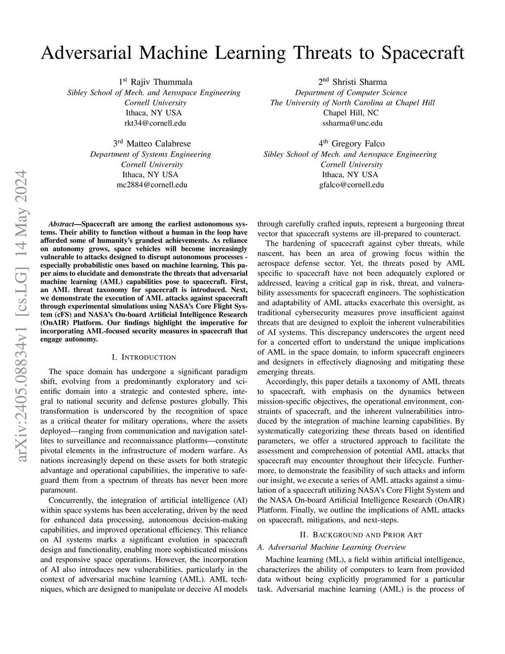 Spacecraft are among the earliest autonomous systems. Their ability to function without a human in the loop have afforded some of humanity's grandest achievements. As reliance on autonomy grows, space vehicles will become increasingly vulnerable to attacks designed to disrupt autonomous processes-especially probabilistic ones based on machine learning. This paper aims to elucidate and demonstrate the threats that adversarial machine learning (AML) capabilities pose to spacecraft. First, an AML threat taxonomy for spacecraft is introduced. Next, we demonstrate the execution of AML attacks against spacecraft through experimental simulations using NASA's Core Flight System (cFS) and NASA's On-board Artificial Intelligence Research (OnAIR) Platform. Our findings highlight the imperative for incorporating AML-focused security measures in spacecraft that engage autonomy.
