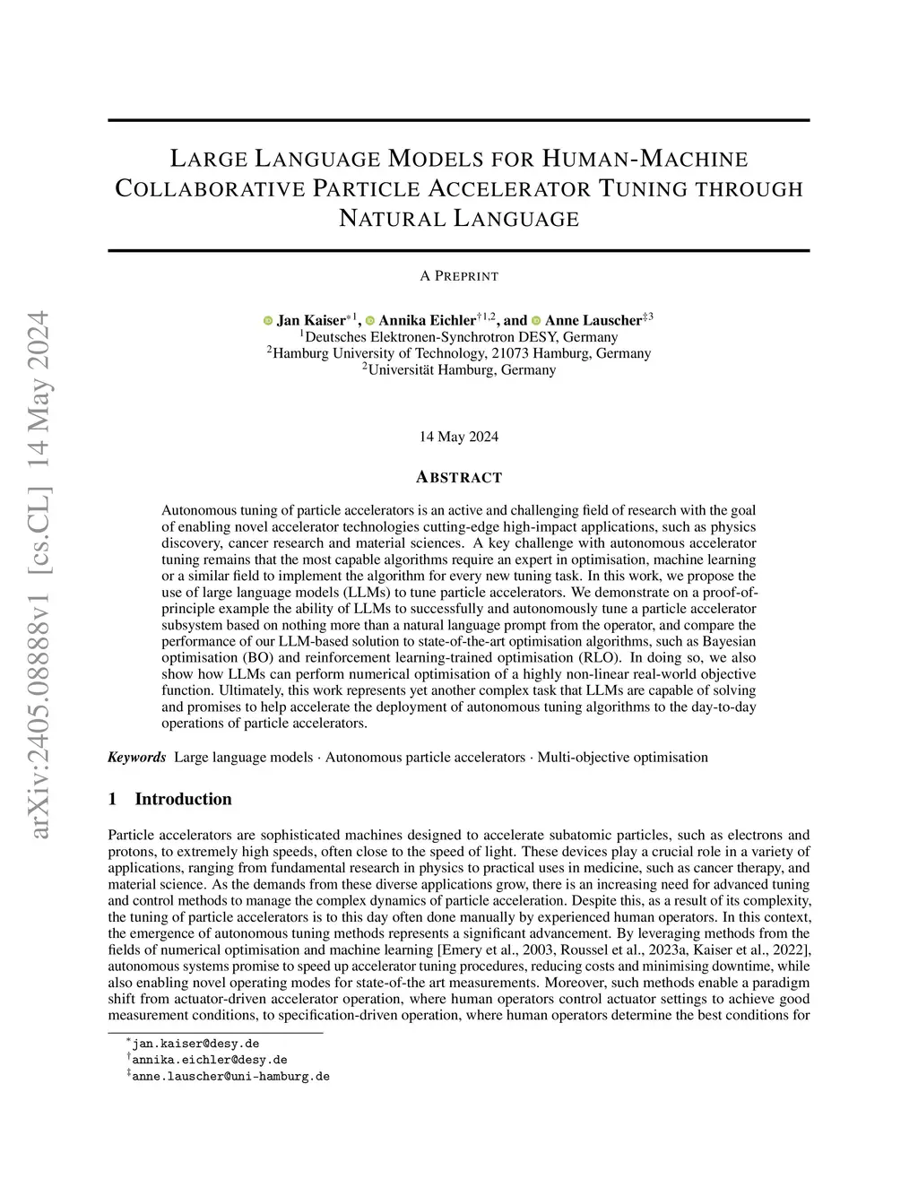 Autonomous tuning of particle accelerators is an active and challenging field of research with the goal of enabling novel accelerator technologies cutting-edge high-impact applications, such as physics discovery, cancer research and material sciences. A key challenge with autonomous accelerator tuning remains that the most capable algorithms require an expert in optimisation, machine learning or a similar field to implement the algorithm for every new tuning task. In this work, we propose the use of large language models (LLMs) to tune particle accelerators. We demonstrate on a proof-of-principle example the ability of LLMs to successfully and autonomously tune a particle accelerator subsystem based on nothing more than a natural language prompt from the operator, and compare the performance of our LLM-based solution to state-of-the-art optimisation algorithms, such as Bayesian optimisation (BO) and reinforcement learning-trained optimisation (RLO). In doing so, we also show how LLMs can perform numerical optimisation of a highly non-linear real-world objective function. Ultimately, this work represents yet another complex task that LLMs are capable of solving and promises to help accelerate the deployment of autonomous tuning algorithms to the day-to-day operations of particle accelerators.