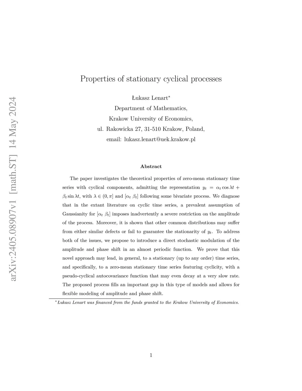 The paper investigates the theoretical properties of zero-mean stationary time series with cyclical components, admitting the representation , with and following some bivariate process. We diagnose that in the extant literature on cyclic time series, a prevalent assumption of Gaussianity for imposes inadvertently a severe restriction on the amplitude of the process. Moreover, it is shown that other common distributions may suffer from either similar defects or fail to guarantee the stationarity of . To address both of the issues, we propose to introduce a direct stochastic modulation of the amplitude and phase shift in an almost periodic function. We prove that this novel approach may lead, in general, to a stationary (up to any order) time series, and specifically, to a zero-mean stationary time series featuring cyclicity, with a pseudo-cyclical autocovariance function that may even decay at a very slow rate. The proposed process fills an important gap in this type of models and allows for flexible modeling of amplitude and phase shift.