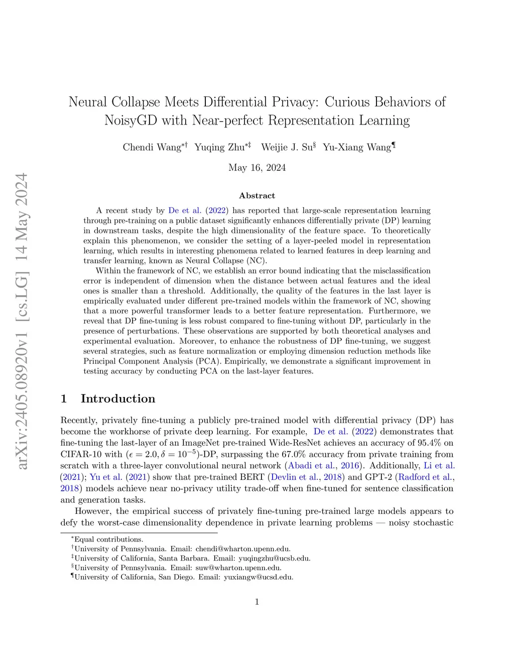 A recent study by De et al. (2022) has reported that large-scale representation learning through pre-training on a public dataset significantly enhances differentially private (DP) learning in downstream tasks, despite the high dimensionality of the feature space. To theoretically explain this phenomenon, we consider the setting of a layer-peeled model in representation learning, which results in interesting phenomena related to learned features in deep learning and transfer learning, known as Neural Collapse (NC). Within the framework of NC, we establish an error bound indicating that the misclassification error is independent of dimension when the distance between actual features and the ideal ones is smaller than a threshold. Additionally, the quality of the features in the last layer is empirically evaluated under different pre-trained models within the framework of NC, showing that a more powerful transformer leads to a better feature representation. Furthermore, we reveal that DP fine-tuning is less robust compared to fine-tuning without DP, particularly in the presence of perturbations. These observations are supported by both theoretical analyses and experimental evaluation. Moreover, to enhance the robustness of DP fine-tuning, we suggest several strategies, such as feature normalization or employing dimension reduction methods like Principal Component Analysis (PCA). Empirically, we demonstrate a significant improvement in testing accuracy by conducting PCA on the last-layer features.