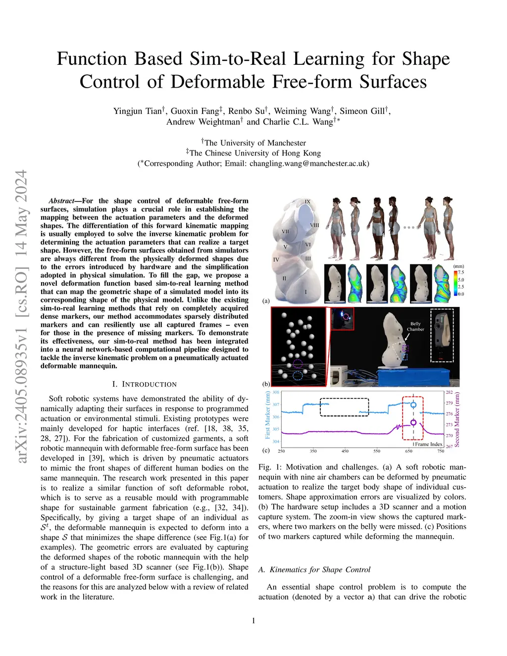 For the shape control of deformable free-form surfaces, simulation plays a crucial role in establishing the mapping between the actuation parameters and the deformed shapes. The differentiation of this forward kinematic mapping is usually employed to solve the inverse kinematic problem for determining the actuation parameters that can realize a target shape. However, the free-form surfaces obtained from simulators are always different from the physically deformed shapes due to the errors introduced by hardware and the simplification adopted in physical simulation. To fill the gap, we propose a novel deformation function based sim-to-real learning method that can map the geometric shape of a simulated model into its corresponding shape of the physical model. Unlike the existing sim-to-real learning methods that rely on completely acquired dense markers, our method accommodates sparsely distributed markers and can resiliently use all captured frames -- even for those in the presence of missing markers. To demonstrate its effectiveness, our sim-to-real method has been integrated into a neural network-based computational pipeline designed to tackle the inverse kinematic problem on a pneumatically actuated deformable mannequin.