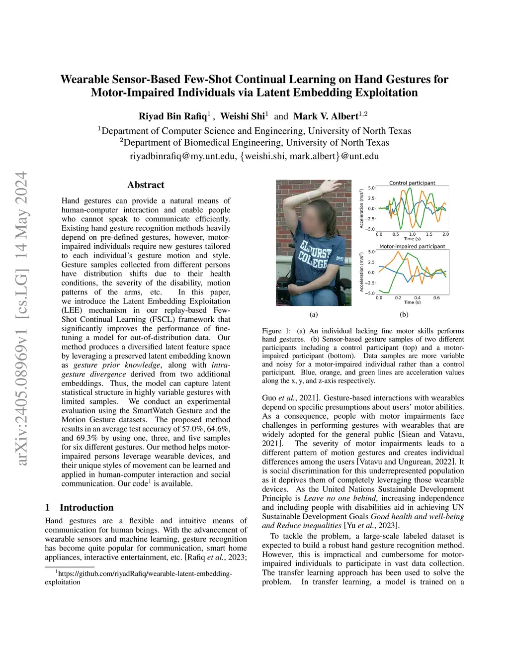 Hand gestures can provide a natural means of human-computer interaction and enable people who cannot speak to communicate efficiently. Existing hand gesture recognition methods heavily depend on pre-defined gestures, however, motor-impaired individuals require new gestures tailored to each individual's gesture motion and style. Gesture samples collected from different persons have distribution shifts due to their health conditions, the severity of the disability, motion patterns of the arms, etc. In this paper, we introduce the Latent Embedding Exploitation (LEE) mechanism in our replay-based Few-Shot Continual Learning (FSCL) framework that significantly improves the performance of fine-tuning a model for out-of-distribution data. Our method produces a diversified latent feature space by leveraging a preserved latent embedding known as gesture prior knowledge, along with intra-gesture divergence derived from two additional embeddings. Thus, the model can capture latent statistical structure in highly variable gestures with limited samples. We conduct an experimental evaluation using the SmartWatch Gesture and the Motion Gesture datasets. The proposed method results in an average test accuracy of 57.0%, 64.6%, and 69.3% by using one, three, and five samples for six different gestures. Our method helps motor-impaired persons leverage wearable devices, and their unique styles of movement can be learned and applied in human-computer interaction and social communication. Code is available at: https://github.com/riyadRafiq/wearable-latent-embedding-exploitation