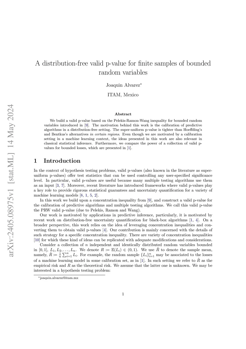 We build a valid p-value based on a concentration inequality for bounded random variables introduced by Pelekis, Ramon and Wang. The motivation behind this work is the calibration of predictive algorithms in a distribution-free setting. The super-uniform p-value is tighter than Hoeffding and Bentkus alternatives in certain regions. Even though we are motivated by a calibration setting in a machine learning context, the ideas presented in this work are also relevant in classical statistical inference. Furthermore, we compare the power of a collection of valid p- values for bounded losses, which are presented in previous literature.