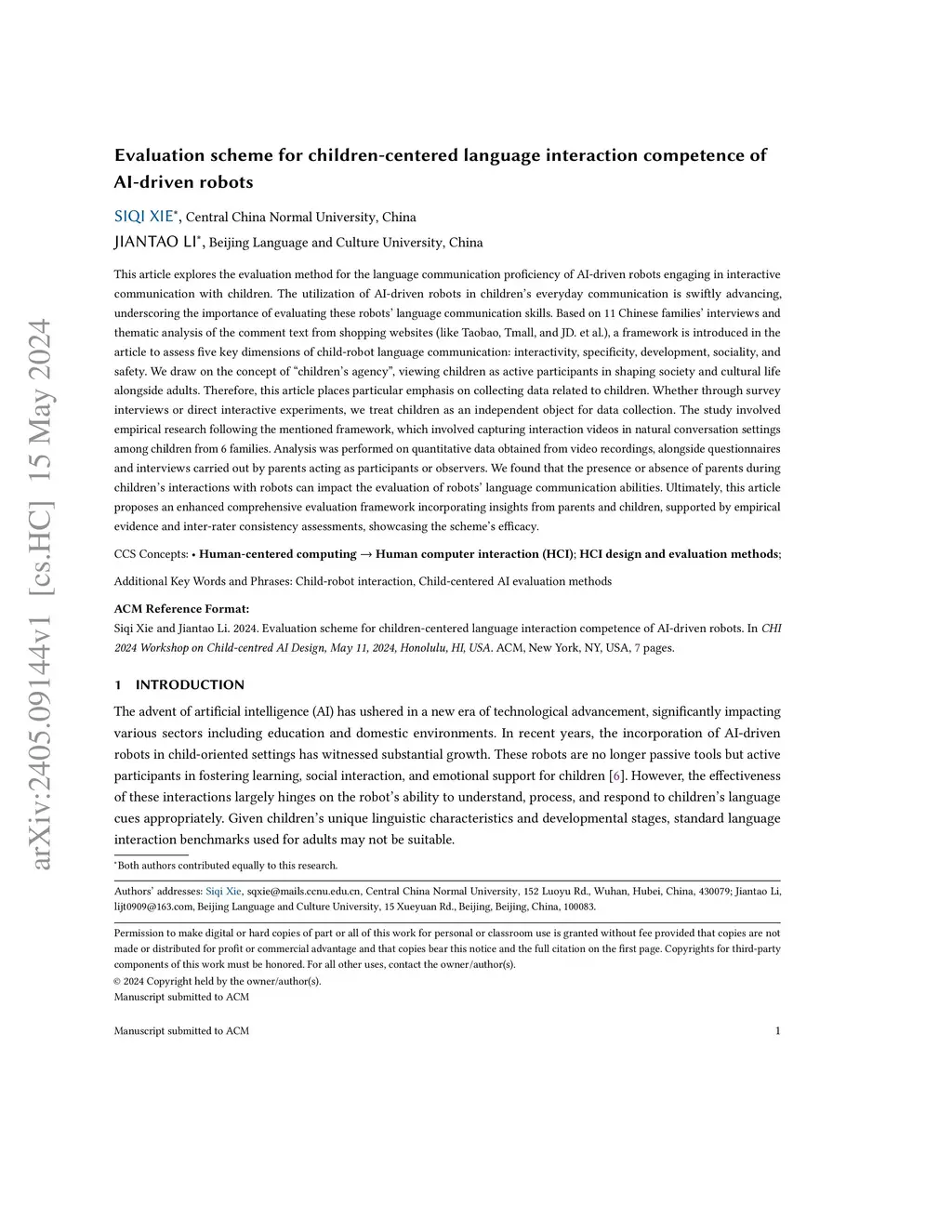 This article explores the evaluation method for the language communication proficiency of AI-driven robots engaging in interactive communication with children. The utilization of AI-driven robots in children's everyday communication is swiftly advancing, underscoring the importance of evaluating these robots'language communication skills. Based on 11 Chinese families' interviews and thematic analysis of the comment text from shopping websites, a framework is introduced in the article to assess five key dimensions of child-robot language communication: interactivity, specificity, development, sociality, and safety. We draw on the concept of "children's agency", viewing children as active participants in shaping society and cultural life alongside adults. Therefore, this article places particular emphasis on collecting data related to children. Whether through survey interviews or direct interactive experiments, we treat children as an independent object for data collection. The study involved empirical research following the mentioned framework, which involved capturing interaction videos in natural conversation settings among children from 6 families. Analysis was performed on quantitative data obtained from video recordings, alongside questionnaires and interviews carried out by parents acting as participants or observers. We found that the presence or absence of parents during children's interactions with robots can impact the evaluation of robots'language communication abilities. Ultimately, this article proposes an enhanced comprehensive evaluation framework incorporating insights from parents and children, supported by empirical evidence and inter-rater consistency assessments, showcasing the scheme's efficacy.