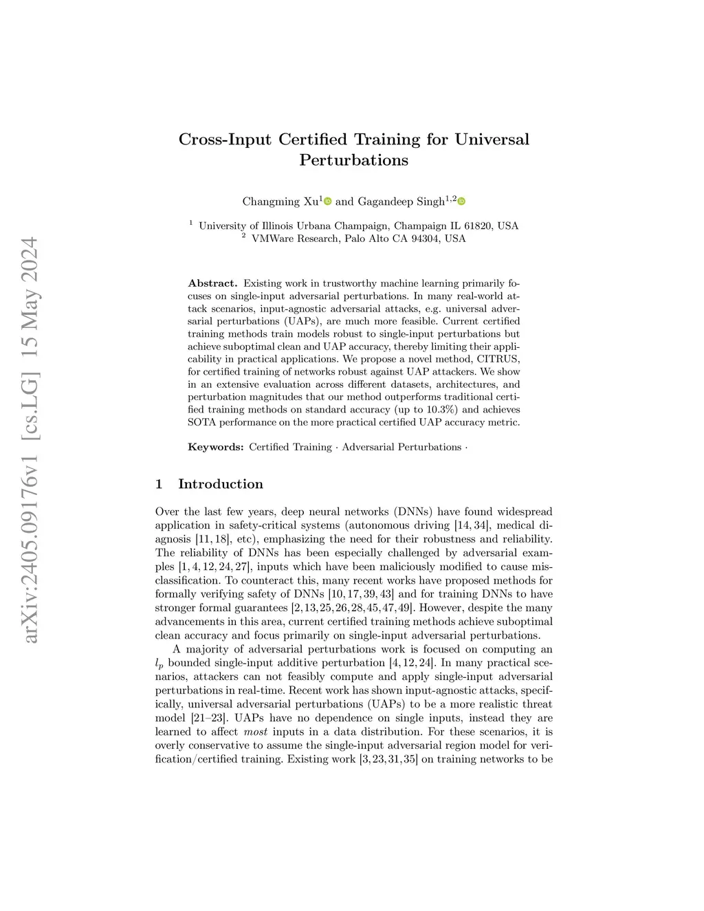 Existing work in trustworthy machine learning primarily focuses on single-input adversarial perturbations. In many real-world attack scenarios, input-agnostic adversarial attacks, e.g. universal adversarial perturbations (UAPs), are much more feasible. Current certified training methods train models robust to single-input perturbations but achieve suboptimal clean and UAP accuracy, thereby limiting their applicability in practical applications. We propose a novel method, CITRUS, for certified training of networks robust against UAP attackers. We show in an extensive evaluation across different datasets, architectures, and perturbation magnitudes that our method outperforms traditional certified training methods on standard accuracy (up to 10.3\%) and achieves SOTA performance on the more practical certified UAP accuracy metric.