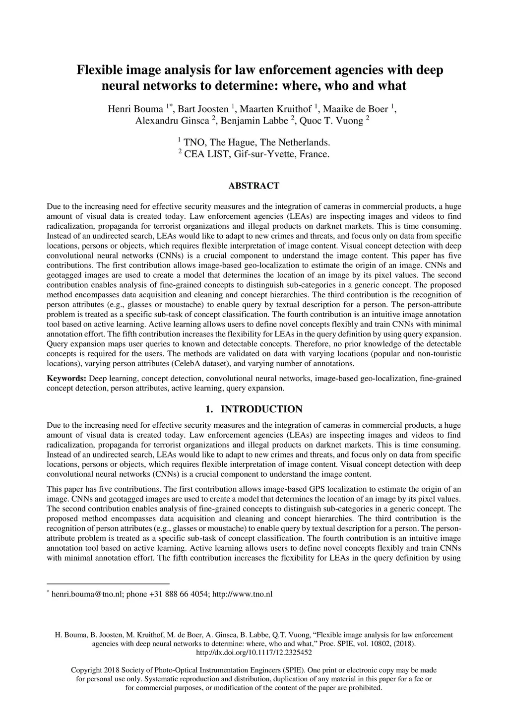 Due to the increasing need for effective security measures and the integration of cameras in commercial products, a hugeamount of visual data is created today. Law enforcement agencies (LEAs) are inspecting images and videos to findradicalization, propaganda for terrorist organizations and illegal products on darknet markets. This is time consuming.Instead of an undirected search, LEAs would like to adapt to new crimes and threats, and focus only on data from specificlocations, persons or objects, which requires flexible interpretation of image content. Visual concept detection with deepconvolutional neural networks (CNNs) is a crucial component to understand the image content. This paper has fivecontributions. The first contribution allows image-based geo-localization to estimate the origin of an image. CNNs andgeotagged images are used to create a model that determines the location of an image by its pixel values. The secondcontribution enables analysis of fine-grained concepts to distinguish sub-categories in a generic concept. The proposedmethod encompasses data acquisition and cleaning and concept hierarchies. The third contribution is the recognition ofperson attributes (e.g., glasses or moustache) to enable query by textual description for a person. The person-attributeproblem is treated as a specific sub-task of concept classification. The fourth contribution is an intuitive image annotationtool based on active learning. Active learning allows users to define novel concepts flexibly and train CNNs with minimalannotation effort. The fifth contribution increases the flexibility for LEAs in the query definition by using query expansion.Query expansion maps user queries to known and detectable concepts. Therefore, no prior knowledge of the detectableconcepts is required for the users. The methods are validated on data with varying locations (popular and non-touristiclocations), varying person attributes (CelebA dataset), and varying number of annotations.