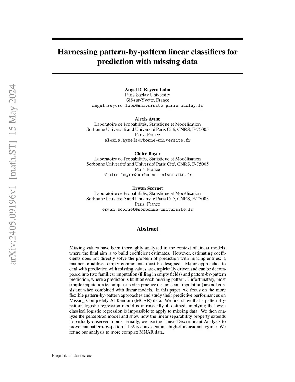 Missing values have been thoroughly analyzed in the context of linear models, where the final aim is to build coefficient estimates. However, estimating coefficients does not directly solve the problem of prediction with missing entries: a manner to address empty components must be designed. Major approaches to deal with prediction with missing values are empirically driven and can be decomposed into two families: imputation (filling in empty fields) and pattern-by-pattern prediction, where a predictor is built on each missing pattern. Unfortunately, most simple imputation techniques used in practice (as constant imputation) are not consistent when combined with linear models. In this paper, we focus on the more flexible pattern-by-pattern approaches and study their predictive performances on Missing Completely At Random (MCAR) data. We first show that a pattern-by-pattern logistic regression model is intrinsically ill-defined, implying that even classical logistic regression is impossible to apply to missing data. We then analyze the perceptron model and show how the linear separability property extends to partially-observed inputs. Finally, we use the Linear Discriminant Analysis to prove that pattern-by-pattern LDA is consistent in a high-dimensional regime. We refine our analysis to more complex MNAR data.