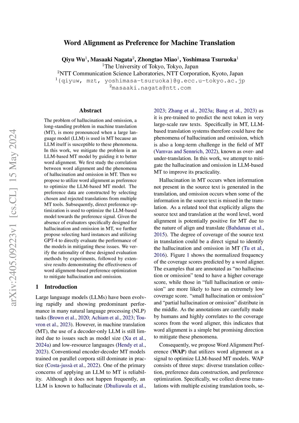 The problem of hallucination and omission, a long-standing problem in machine translation (MT), is more pronounced when a large language model (LLM) is used in MT because an LLM itself is susceptible to these phenomena. In this work, we mitigate the problem in an LLM-based MT model by guiding it to better word alignment. We first study the correlation between word alignment and the phenomena of hallucination and omission in MT. Then we propose to utilize word alignment as preference to optimize the LLM-based MT model. The preference data are constructed by selecting chosen and rejected translations from multiple MT tools. Subsequently, direct preference optimization is used to optimize the LLM-based model towards the preference signal. Given the absence of evaluators specifically designed for hallucination and omission in MT, we further propose selecting hard instances and utilizing GPT-4 to directly evaluate the performance of the models in mitigating these issues. We verify the rationality of these designed evaluation methods by experiments, followed by extensive results demonstrating the effectiveness of word alignment-based preference optimization to mitigate hallucination and omission.