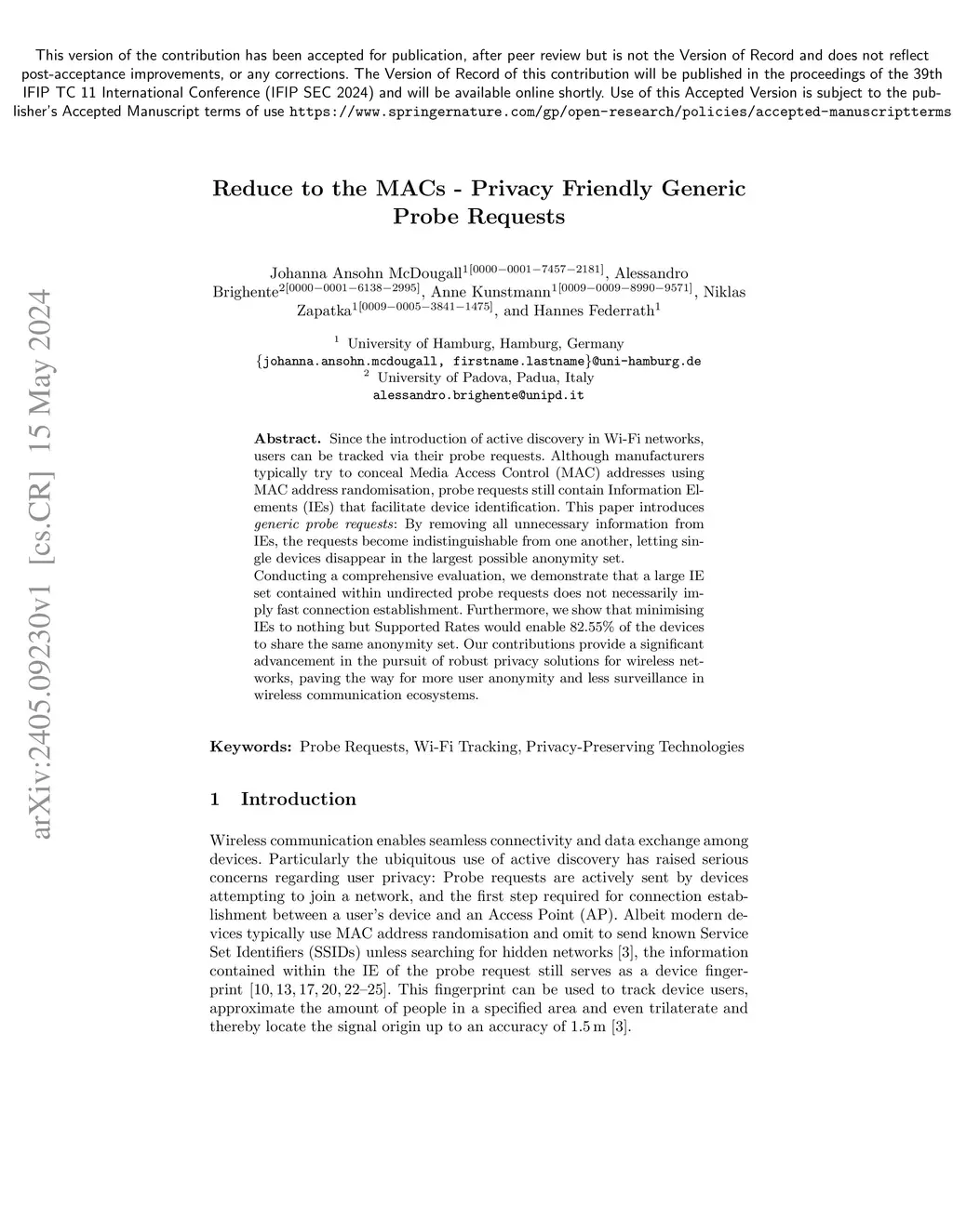 Abstract. Since the introduction of active discovery in Wi-Fi networks, users can be tracked via their probe requests. Although manufacturers typically try to conceal Media Access Control (MAC) addresses using MAC address randomisation, probe requests still contain Information Elements (IEs) that facilitate device identification. This paper introduces generic probe requests: By removing all unnecessary information from IEs, the requests become indistinguishable from one another, letting single devices disappear in the largest possible anonymity set. Conducting a comprehensive evaluation, we demonstrate that a large IE set contained within undirected probe requests does not necessarily imply fast connection establishment. Furthermore, we show that minimising IEs to nothing but Supported Rates would enable 82.55% of the devices to share the same anonymity set. Our contributions provide a significant advancement in the pursuit of robust privacy solutions for wireless networks, paving the way for more user anonymity and less surveillance in wireless communication ecosystems.