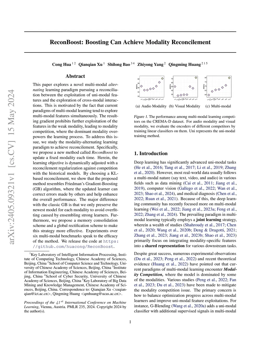 This paper explores a novel multi-modal alternating learning paradigm pursuing a reconciliation between the exploitation of uni-modal features and the exploration of cross-modal interactions. This is motivated by the fact that current paradigms of multi-modal learning tend to explore multi-modal features simultaneously. The resulting gradient prohibits further exploitation of the features in the weak modality, leading to modality competition, where the dominant modality overpowers the learning process. To address this issue, we study the modality-alternating learning paradigm to achieve reconcilement. Specifically, we propose a new method called ReconBoost to update a fixed modality each time. Herein, the learning objective is dynamically adjusted with a reconcilement regularization against competition with the historical models. By choosing a KL-based reconcilement, we show that the proposed method resembles Friedman's Gradient-Boosting (GB) algorithm, where the updated learner can correct errors made by others and help enhance the overall performance. The major difference with the classic GB is that we only preserve the newest model for each modality to avoid overfitting caused by ensembling strong learners. Furthermore, we propose a memory consolidation scheme and a global rectification scheme to make this strategy more effective. Experiments over six multi-modal benchmarks speak to the efficacy of the method. We release the code at https://github.com/huacong/ReconBoost.