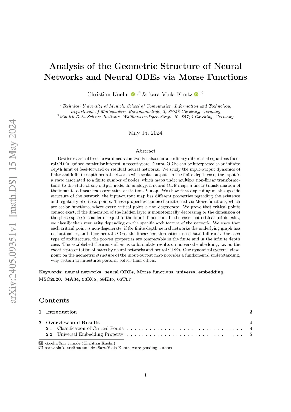 Besides classical feed-forward neural networks such as multilayer perceptrons, also neural ordinary differential equations (neural ODEs) have gained particular interest in recent years. Neural ODEs can be interpreted as an infinite depth limit of feed-forward or residual neural networks. We study the input-output dynamics of finite and infinite depth neural networks with scalar output. In the finite depth case, the input is a state associated with a finite number of nodes, which maps under multiple non-linear transformations to the state of one output node. In analogy, a neural ODE maps an affine linear transformation of the input to an affine linear transformation of its time- map. We show that, depending on the specific structure of the network, the input-output map has different properties regarding the existence and regularity of critical points. These properties can be characterized via Morse functions, which are scalar functions where every critical point is non-degenerate. We prove that critical points cannot exist if the dimension of the hidden layer is monotonically decreasing or the dimension of the phase space is smaller than or equal to the input dimension. In the case that critical points exist, we classify their regularity depending on the specific architecture of the network. We show that except for a Lebesgue measure zero set in the weight space, each critical point is non-degenerate if for finite depth neural networks the underlying graph has no bottleneck, and if for neural ODEs, the affine linear transformations used have full rank. For each type of architecture, the proven properties are comparable in the finite and infinite depth cases. The established theorems allow us to formulate results on universal embedding and universal approximation, i.e., on the exact and approximate representation of maps by neural networks and neural ODEs.