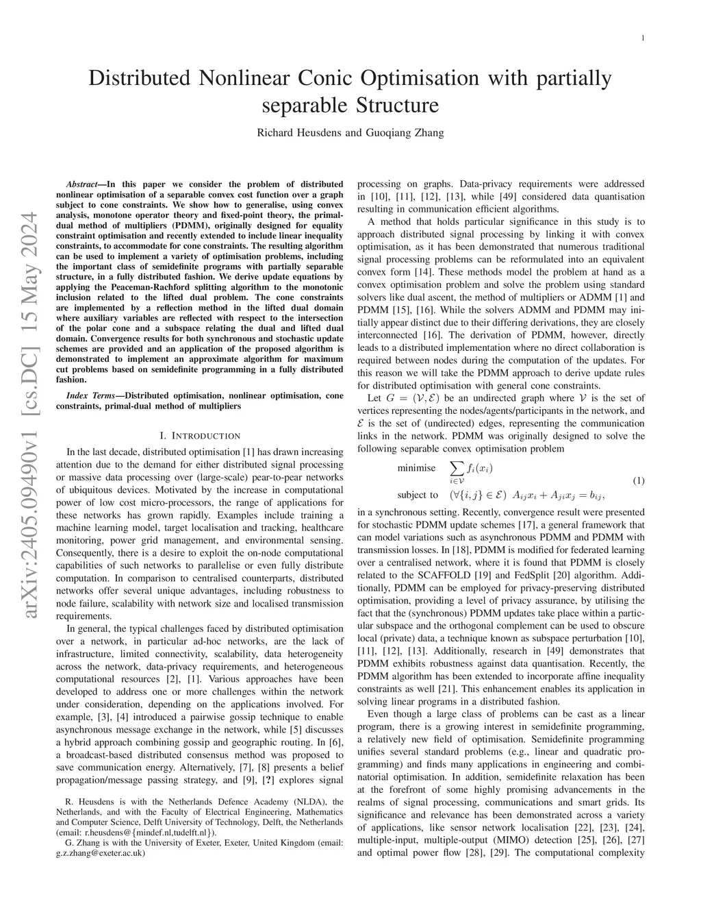 In this paper we consider the problem of distributed nonlinear optimisation of a separable convex cost function over a graph subject to cone constraints. We show how to generalise, using convex analysis, monotone operator theory and fixed-point theory, the primal-dual method of multipliers (PDMM), originally designed for equality constraint optimisation and recently extended to include linear inequality constraints, to accommodate for cone constraints. The resulting algorithm can be used to implement a variety of optimisation problems, including the important class of semidefinite programs with partially separable structure, in a fully distributed fashion. We derive update equations by applying the Peaceman-Rachford splitting algorithm to the monotonic inclusion related to the lifted dual problem. The cone constraints are implemented by a reflection method in the lifted dual domain where auxiliary variables are reflected with respect to the intersection of the polar cone and a subspace relating the dual and lifted dual domain. Convergence results for both synchronous and stochastic update schemes are provided and an application of the proposed algorithm is demonstrated to implement an approximate algorithm for maximum cut problems based on semidefinite programming in a fully distributed fashion.