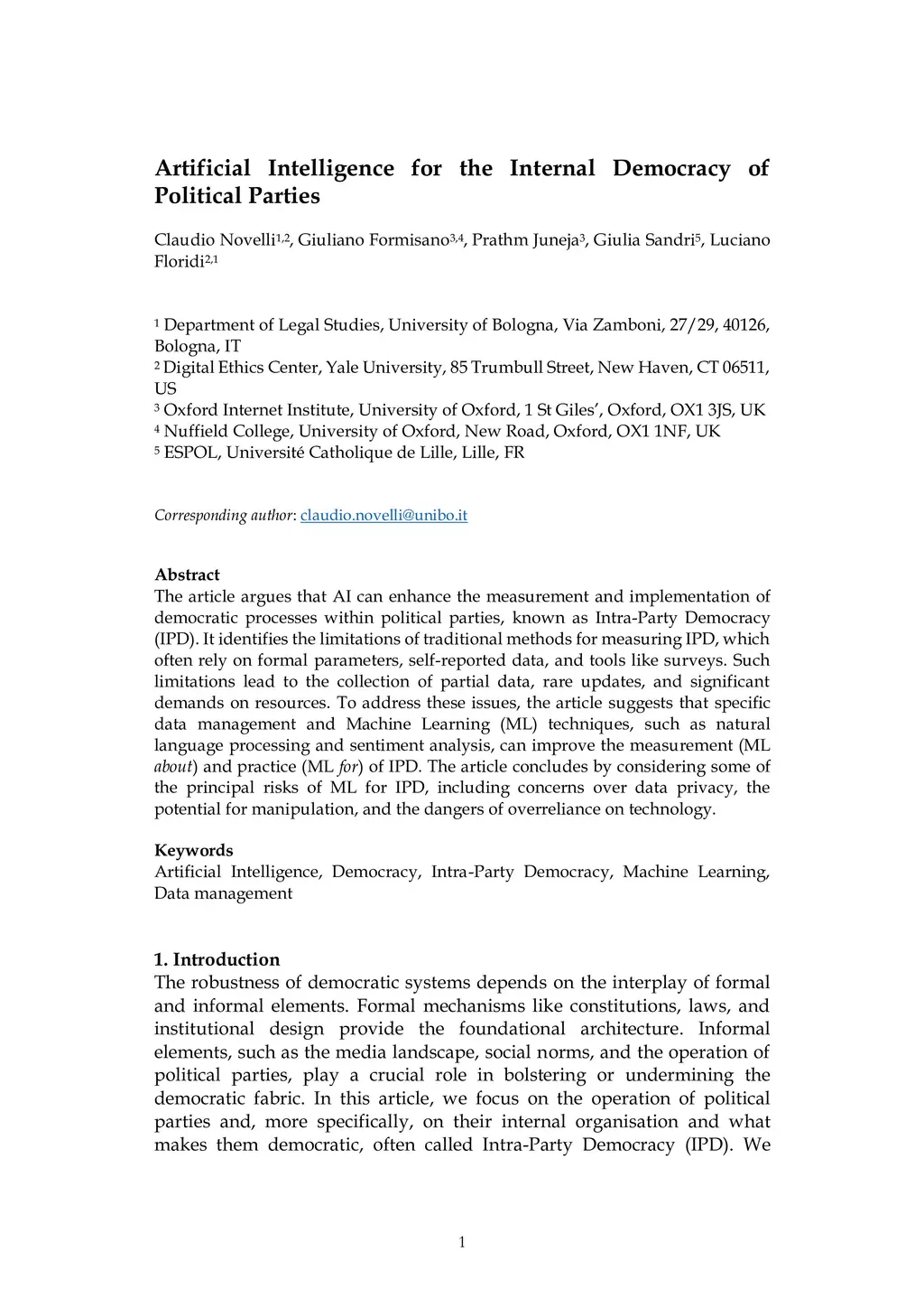 The article argues that AI can enhance the measurement and implementation of democratic processes within political parties, known as Intra-Party Democracy (IPD). It identifies the limitations of traditional methods for measuring IPD, which often rely on formal parameters, self-reported data, and tools like surveys. Such limitations lead to the collection of partial data, rare updates, and significant demands on resources. To address these issues, the article suggests that specific data management and Machine Learning (ML) techniques, such as natural language processing and sentiment analysis, can improve the measurement (ML about) and practice (ML for) of IPD. The article concludes by considering some of the principal risks of ML for IPD, including concerns over data privacy, the potential for manipulation, and the dangers of overreliance on technology.