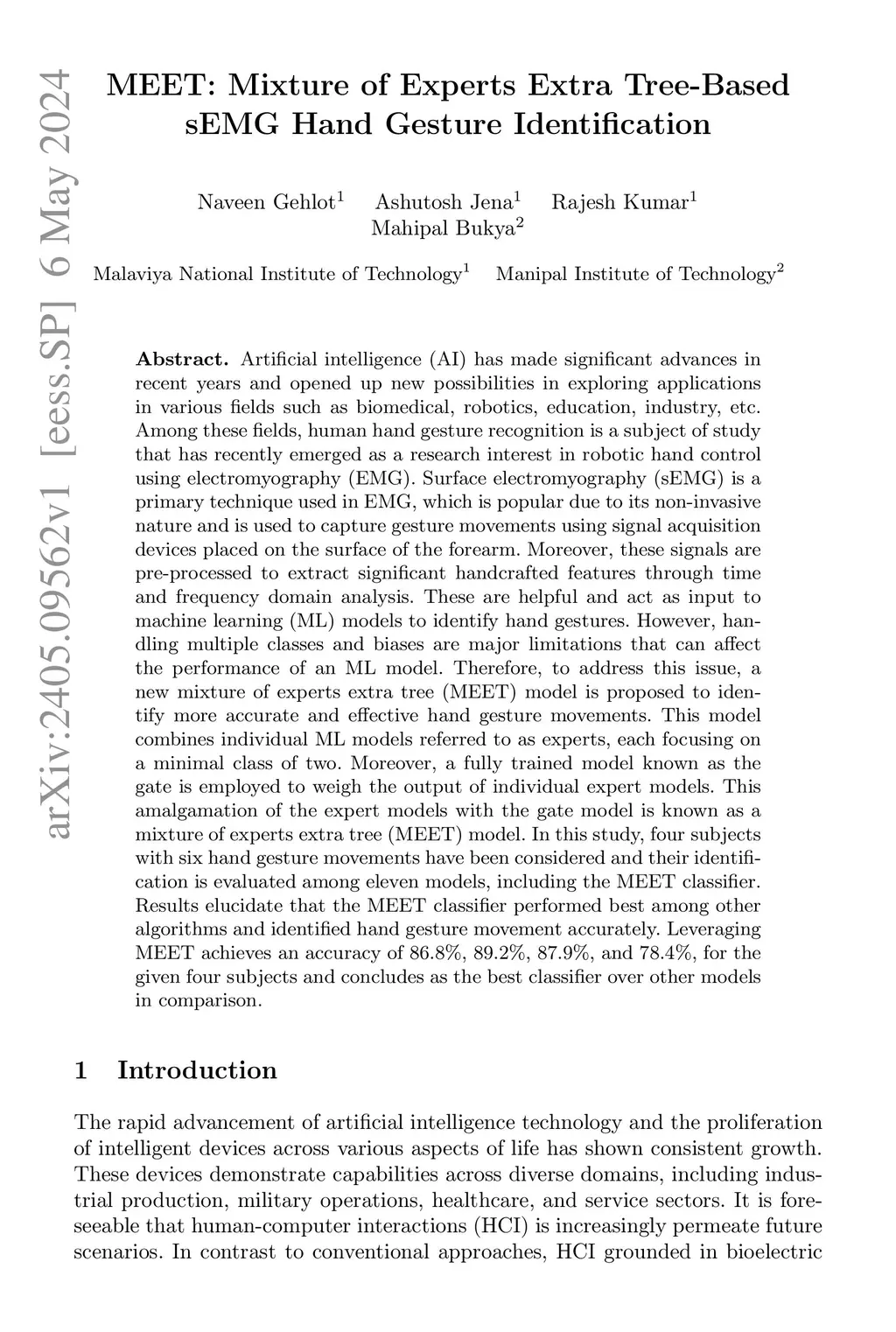 Artificial intelligence (AI) has made significant advances in recent years and opened up new possibilities in exploring applications in various fields such as biomedical, robotics, education, industry, etc. Among these fields, human hand gesture recognition is a subject of study that has recently emerged as a research interest in robotic hand control using electromyography (EMG). Surface electromyography (sEMG) is a primary technique used in EMG, which is popular due to its non-invasive nature and is used to capture gesture movements using signal acquisition devices placed on the surface of the forearm. Moreover, these signals are pre-processed to extract significant handcrafted features through time and frequency domain analysis. These are helpful and act as input to machine learning (ML) models to identify hand gestures. However, handling multiple classes and biases are major limitations that can affect the performance of an ML model. Therefore, to address this issue, a new mixture of experts extra tree (MEET) model is proposed to identify more accurate and effective hand gesture movements. This model combines individual ML models referred to as experts, each focusing on a minimal class of two. Moreover, a fully trained model known as the gate is employed to weigh the output of individual expert models. This amalgamation of the expert models with the gate model is known as a mixture of experts extra tree (MEET) model. In this study, four subjects with six hand gesture movements have been considered and their identification is evaluated among eleven models, including the MEET classifier. Results elucidate that the MEET classifier performed best among other algorithms and identified hand gesture movement accurately.