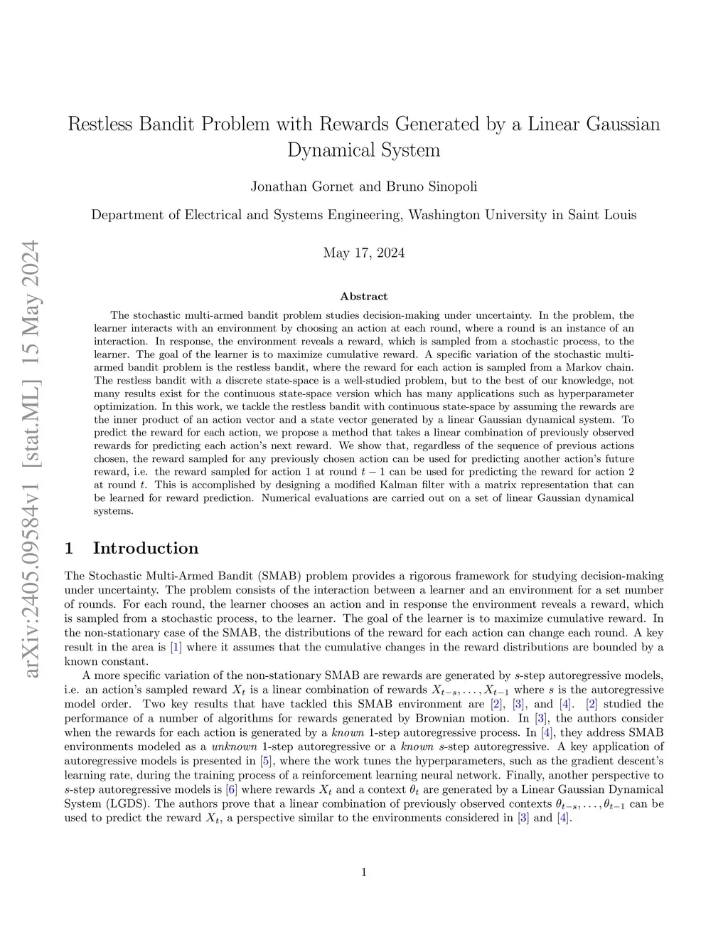Decision-making under uncertainty is a fundamental problem encountered frequently and can be formulated as a stochastic multi-armed bandit problem. In the problem, the learner interacts with an environment by choosing an action at each round, where a round is an instance of an interaction. In response, the environment reveals a reward, which is sampled from a stochastic process, to the learner. The goal of the learner is to maximize cumulative reward. In this work, we assume that the rewards are the inner product of an action vector and a state vector generated by a linear Gaussian dynamical system. To predict the reward for each action, we propose a method that takes a linear combination of previously observed rewards for predicting each action's next reward. We show that, regardless of the sequence of previous actions chosen, the reward sampled for any previously chosen action can be used for predicting another action's future reward, i.e. the reward sampled for action 1 at round can be used for predicting the reward for action at round . This is accomplished by designing a modified Kalman filter with a matrix representation that can be learned for reward prediction. Numerical evaluations are carried out on a set of linear Gaussian dynamical systems and are compared with 2 other well-known stochastic multi-armed bandit algorithms.