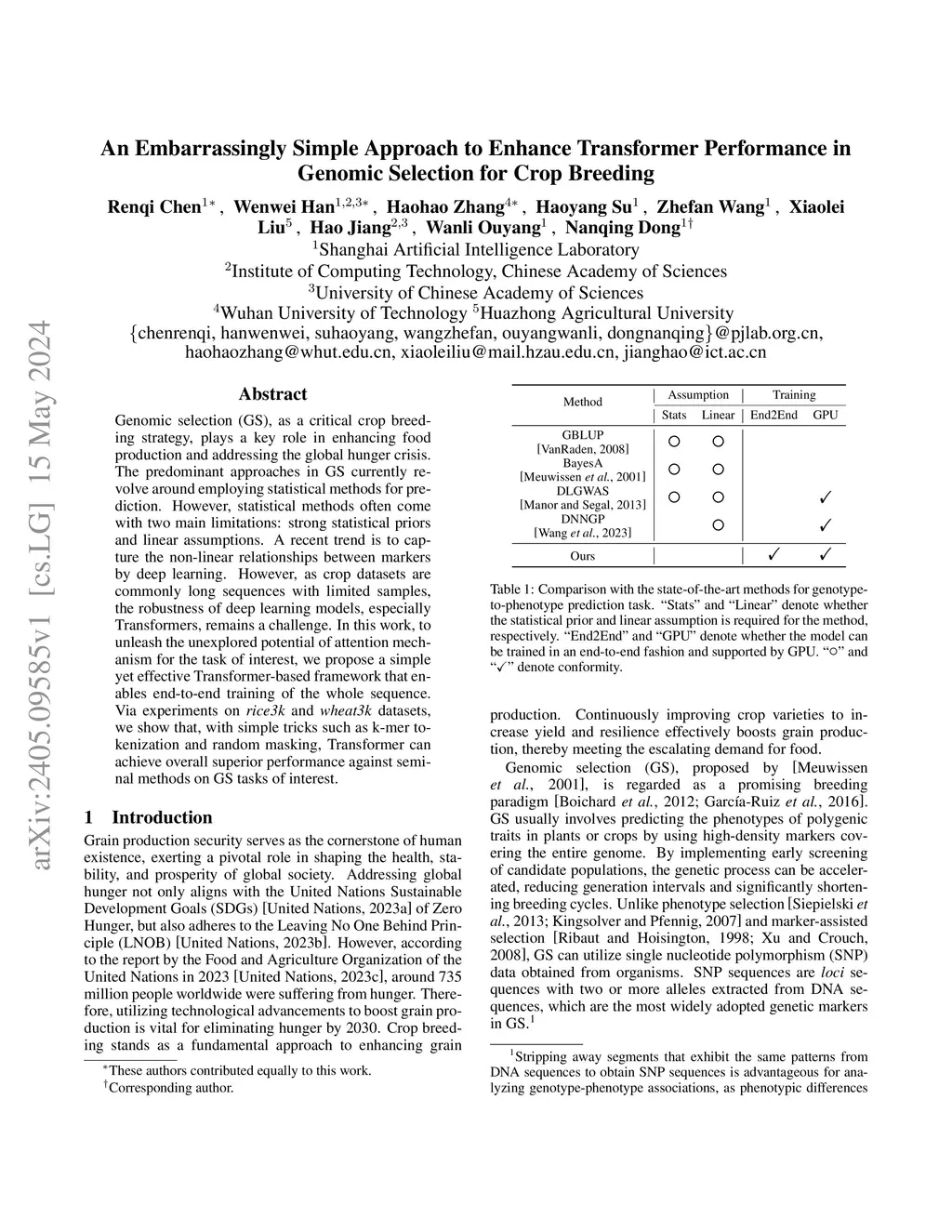 Genomic selection (GS), as a critical crop breeding strategy, plays a key role in enhancing food production and addressing the global hunger crisis. The predominant approaches in GS currently revolve around employing statistical methods for prediction. However, statistical methods often come with two main limitations: strong statistical priors and linear assumptions. A recent trend is to capture the non-linear relationships between markers by deep learning. However, as crop datasets are commonly long sequences with limited samples, the robustness of deep learning models, especially Transformers, remains a challenge. In this work, to unleash the unexplored potential of attention mechanism for the task of interest, we propose a simple yet effective Transformer-based framework that enables end-to-end training of the whole sequence. Via experiments on rice3k and wheat3k datasets, we show that, with simple tricks such as k-mer tokenization and random masking, Transformer can achieve overall superior performance against seminal methods on GS tasks of interest.
