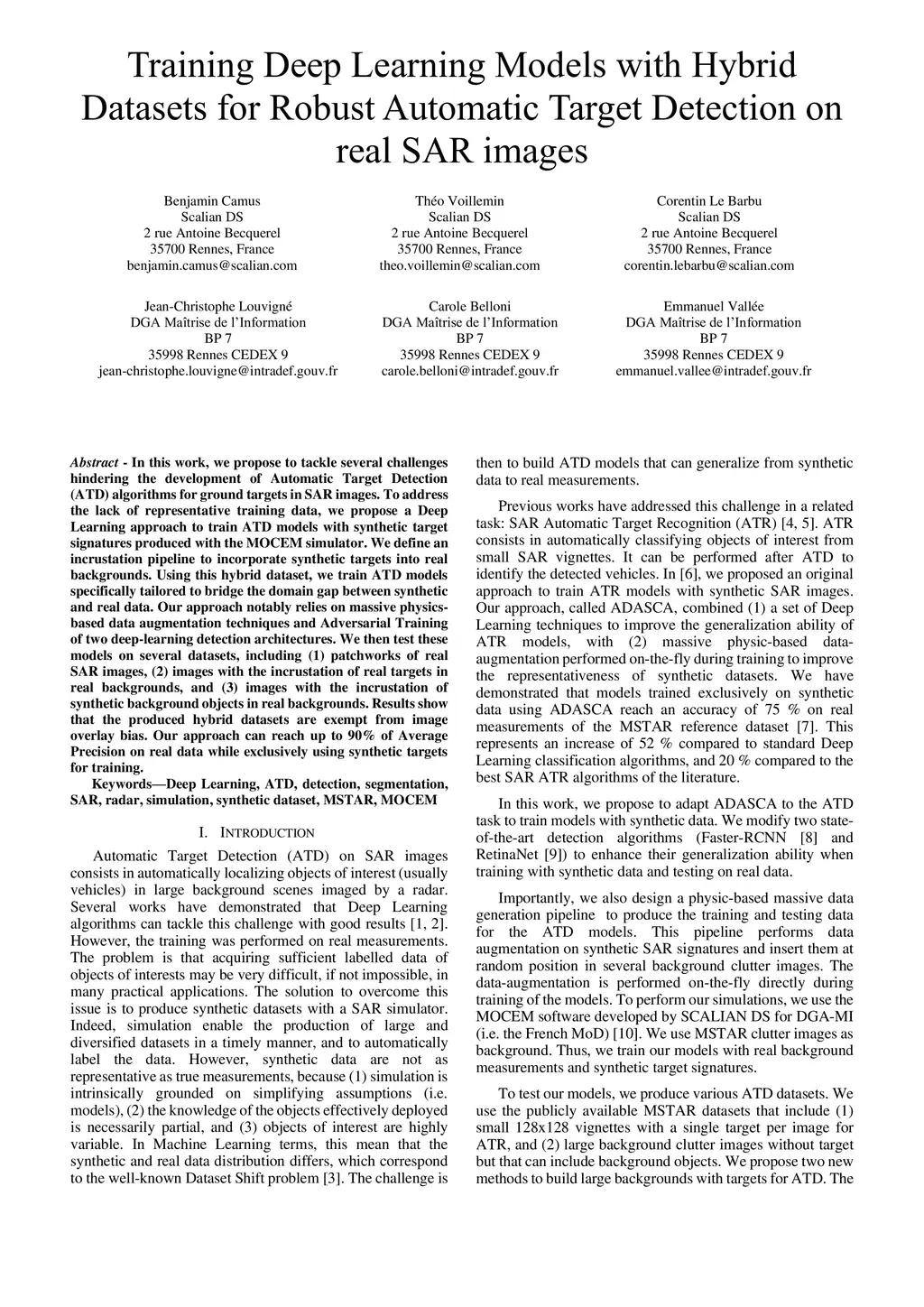 In this work, we propose to tackle several challenges hindering the development of Automatic Target Detection (ATD) algorithms for ground targets in SAR images. To address the lack of representative training data, we propose a Deep Learning approach to train ATD models with synthetic target signatures produced with the MOCEM simulator. We define an incrustation pipeline to incorporate synthetic targets into real backgrounds. Using this hybrid dataset, we train ATD models specifically tailored to bridge the domain gap between synthetic and real data. Our approach notably relies on massive physics-based data augmentation techniques and Adversarial Training of two deep-learning detection architectures. We then test these models on several datasets, including (1) patchworks of real SAR images, (2) images with the incrustation of real targets in real backgrounds, and (3) images with the incrustation of synthetic background objects in real backgrounds. Results show that the produced hybrid datasets are exempt from image overlay bias. Our approach can reach up to 90% of Average Precision on real data while exclusively using synthetic targets for training.