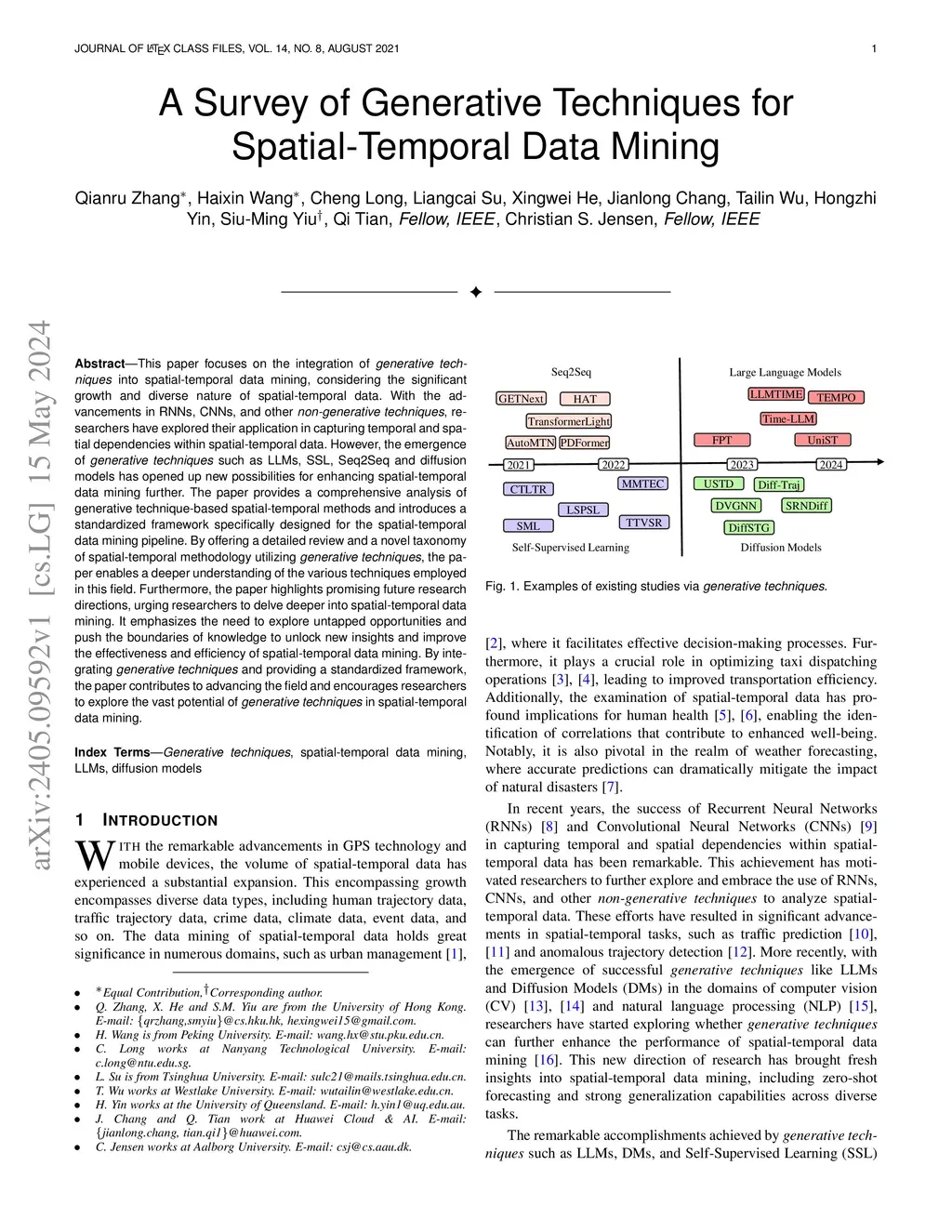 This paper focuses on the integration of generative techniques into spatial-temporal data mining, considering the significant growth and diverse nature of spatial-temporal data. With the advancements in RNNs, CNNs, and other non-generative techniques, researchers have explored their application in capturing temporal and spatial dependencies within spatial-temporal data. However, the emergence of generative techniques such as LLMs, SSL, Seq2Seq and diffusion models has opened up new possibilities for enhancing spatial-temporal data mining further. The paper provides a comprehensive analysis of generative technique-based spatial-temporal methods and introduces a standardized framework specifically designed for the spatial-temporal data mining pipeline. By offering a detailed review and a novel taxonomy of spatial-temporal methodology utilizing generative techniques, the paper enables a deeper understanding of the various techniques employed in this field. Furthermore, the paper highlights promising future research directions, urging researchers to delve deeper into spatial-temporal data mining. It emphasizes the need to explore untapped opportunities and push the boundaries of knowledge to unlock new insights and improve the effectiveness and efficiency of spatial-temporal data mining. By integrating generative techniques and providing a standardized framework, the paper contributes to advancing the field and encourages researchers to explore the vast potential of generative techniques in spatial-temporal data mining.