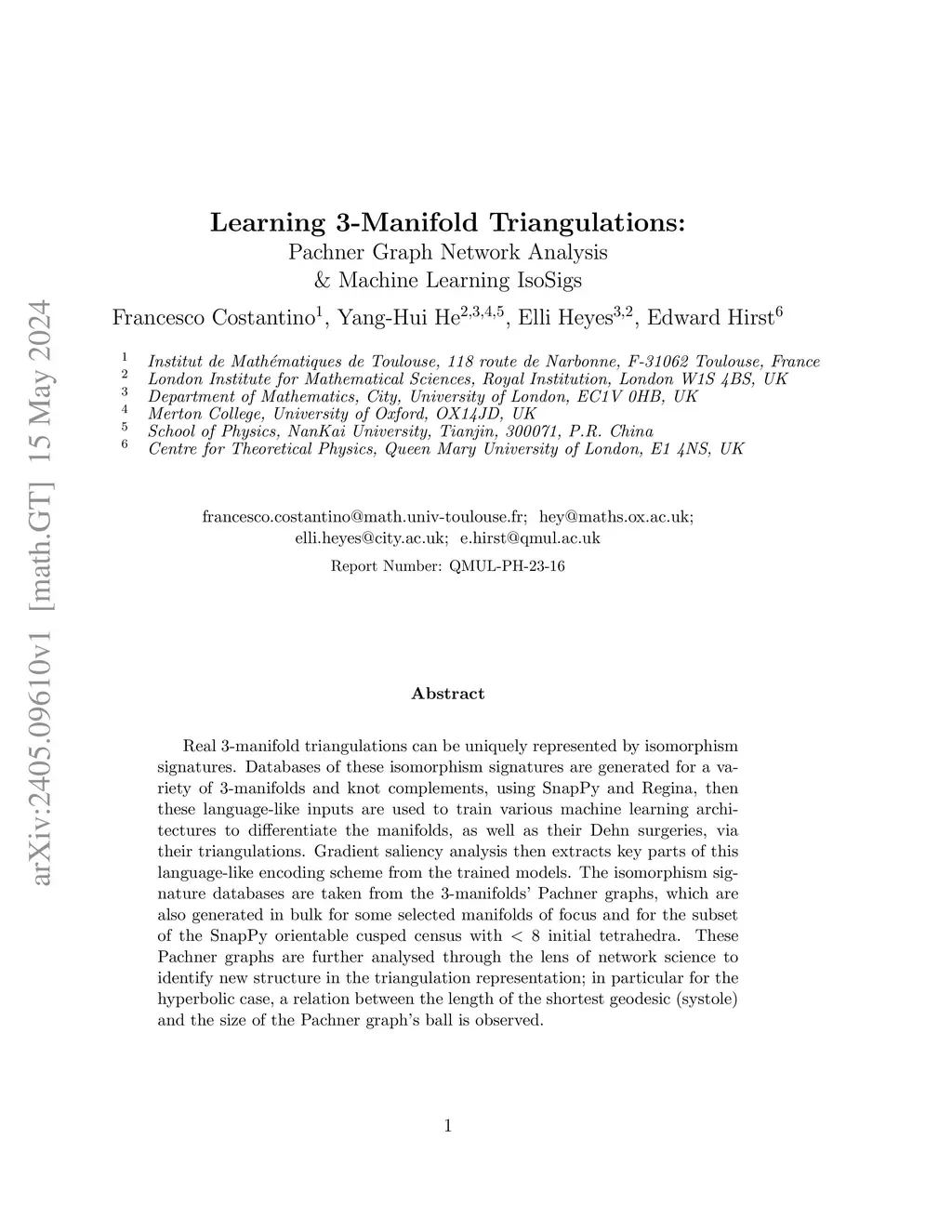 Real 3-manifold triangulations can be uniquely represented by isomorphism signatures. Databases of these isomorphism signatures are generated for a variety of 3-manifolds and knot complements, using SnapPy and Regina, then these language-like inputs are used to train various machine learning architectures to differentiate the manifolds, as well as their Dehn surgeries, via their triangulations. Gradient saliency analysis then extracts key parts of this language-like encoding scheme from the trained models. The isomorphism signature databases are taken from the 3-manifolds' Pachner graphs, which are also generated in bulk for some selected manifolds of focus and for the subset of the SnapPy orientable cusped census with initial tetrahedra. These Pachner graphs are further analysed through the lens of network science to identify new structure in the triangulation representation; in particular for the hyperbolic case, a relation between the length of the shortest geodesic (systole) and the size of the Pachner graph's ball is observed.
