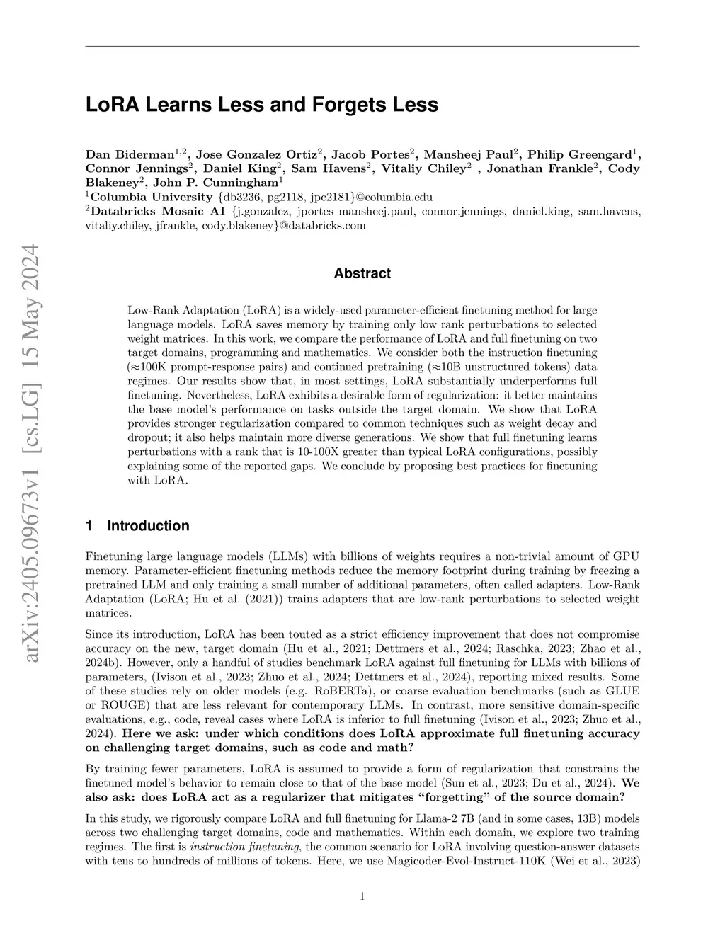 Low-Rank Adaptation (LoRA) is a widely-used parameter-efficient finetuning method for large language models. LoRA saves memory by training only low rank perturbations to selected weight matrices. In this work, we compare the performance of LoRA and full finetuning on two target domains, programming and mathematics. We consider both the instruction finetuning (100K prompt-response pairs) and continued pretraining (10B unstructured tokens) data regimes. Our results show that, in most settings, LoRA substantially underperforms full finetuning. Nevertheless, LoRA exhibits a desirable form of regularization: it better maintains the base model's performance on tasks outside the target domain. We show that LoRA provides stronger regularization compared to common techniques such as weight decay and dropout; it also helps maintain more diverse generations. We show that full finetuning learns perturbations with a rank that is 10-100X greater than typical LoRA configurations, possibly explaining some of the reported gaps. We conclude by proposing best practices for finetuning with LoRA.