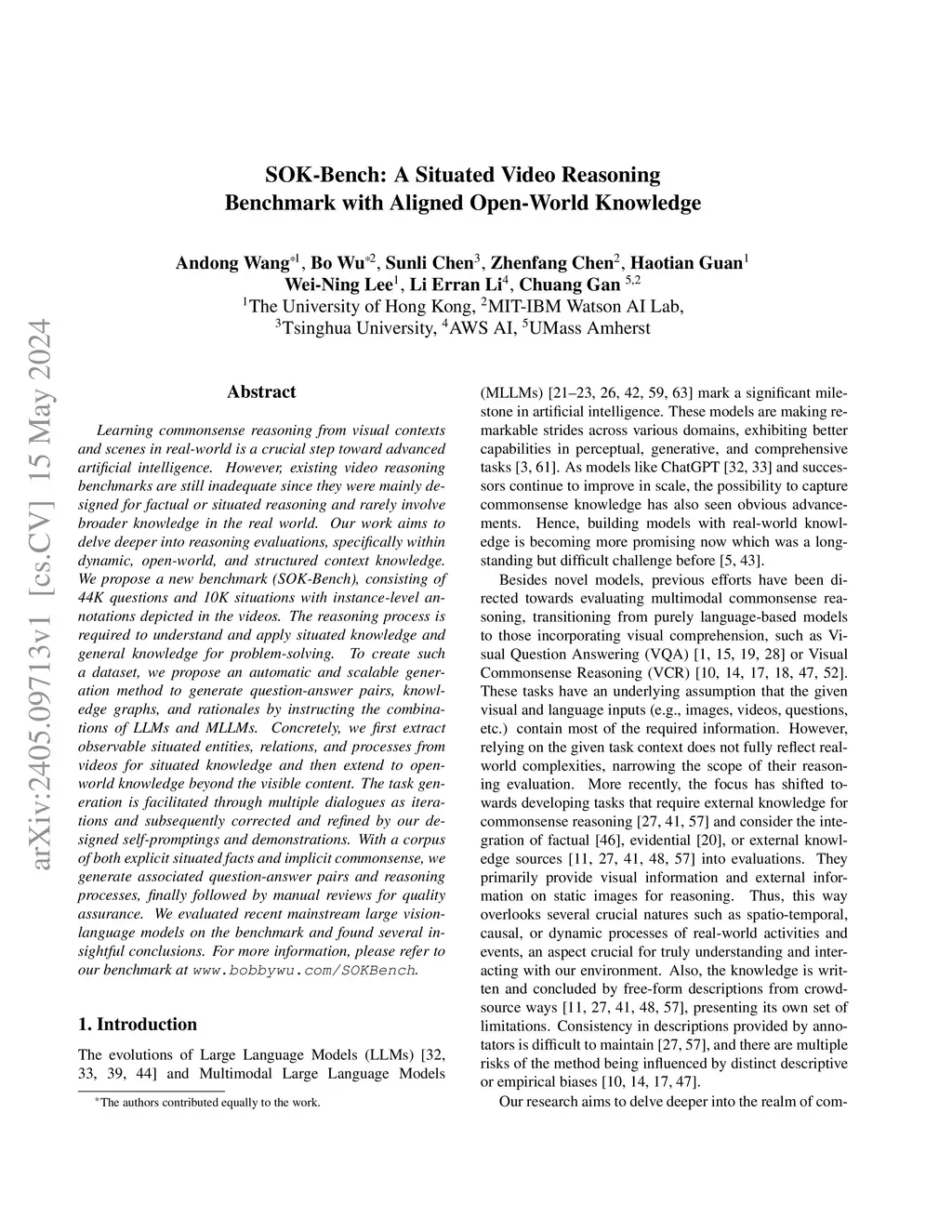 Learning commonsense reasoning from visual contexts and scenes in real-world is a crucial step toward advanced artificial intelligence. However, existing video reasoning benchmarks are still inadequate since they were mainly designed for factual or situated reasoning and rarely involve broader knowledge in the real world. Our work aims to delve deeper into reasoning evaluations, specifically within dynamic, open-world, and structured context knowledge. We propose a new benchmark (SOK-Bench), consisting of 44K questions and 10K situations with instance-level annotations depicted in the videos. The reasoning process is required to understand and apply situated knowledge and general knowledge for problem-solving. To create such a dataset, we propose an automatic and scalable generation method to generate question-answer pairs, knowledge graphs, and rationales by instructing the combinations of LLMs and MLLMs. Concretely, we first extract observable situated entities, relations, and processes from videos for situated knowledge and then extend to open-world knowledge beyond the visible content. The task generation is facilitated through multiple dialogues as iterations and subsequently corrected and refined by our designed self-promptings and demonstrations. With a corpus of both explicit situated facts and implicit commonsense, we generate associated question-answer pairs and reasoning processes, finally followed by manual reviews for quality assurance. We evaluated recent mainstream large vision-language models on the benchmark and found several insightful conclusions. For more information, please refer to our benchmark at www.bobbywu.com/SOKBench.