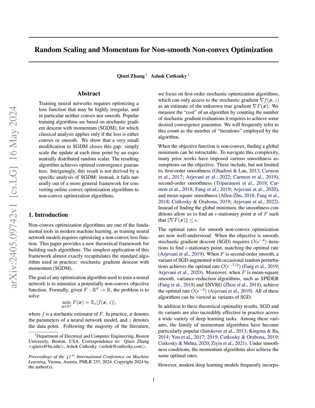 Training neural networks requires optimizing a loss function that may be highly irregular, and in particular neither convex nor smooth. Popular training algorithms are based on stochastic gradient descent with momentum (SGDM), for which classical analysis applies only if the loss is either convex or smooth. We show that a very small modification to SGDM closes this gap: simply scale the update at each time point by an exponentially distributed random scalar. The resulting algorithm achieves optimal convergence guarantees. Intriguingly, this result is not derived by a specific analysis of SGDM: instead, it falls naturally out of a more general framework for converting online convex optimization algorithms to non-convex optimization algorithms.