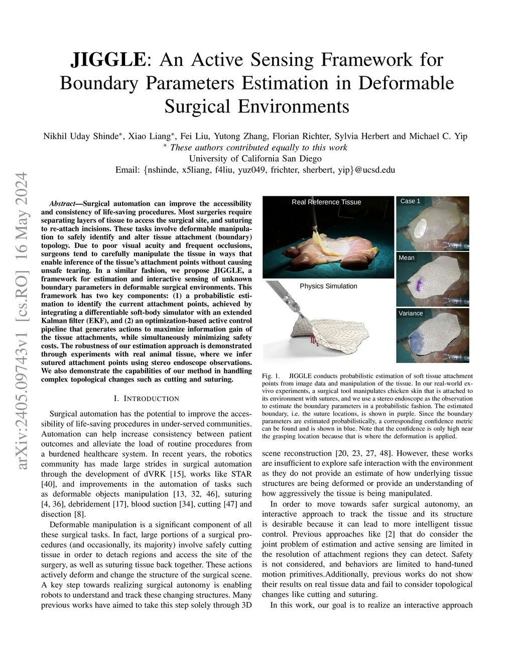 Surgical automation can improve the accessibility and consistency of life saving procedures. Most surgeries require separating layers of tissue to access the surgical site, and suturing to reattach incisions. These tasks involve deformable manipulation to safely identify and alter tissue attachment (boundary) topology. Due to poor visual acuity and frequent occlusions, surgeons tend to carefully manipulate the tissue in ways that enable inference of the tissue's attachment points without causing unsafe tearing. In a similar fashion, we propose JIGGLE, a framework for estimation and interactive sensing of unknown boundary parameters in deformable surgical environments. This framework has two key components: (1) a probabilistic estimation to identify the current attachment points, achieved by integrating a differentiable soft-body simulator with an extended Kalman filter (EKF), and (2) an optimization-based active control pipeline that generates actions to maximize information gain of the tissue attachments, while simultaneously minimizing safety costs. The robustness of our estimation approach is demonstrated through experiments with real animal tissue, where we infer sutured attachment points using stereo endoscope observations. We also demonstrate the capabilities of our method in handling complex topological changes such as cutting and suturing.