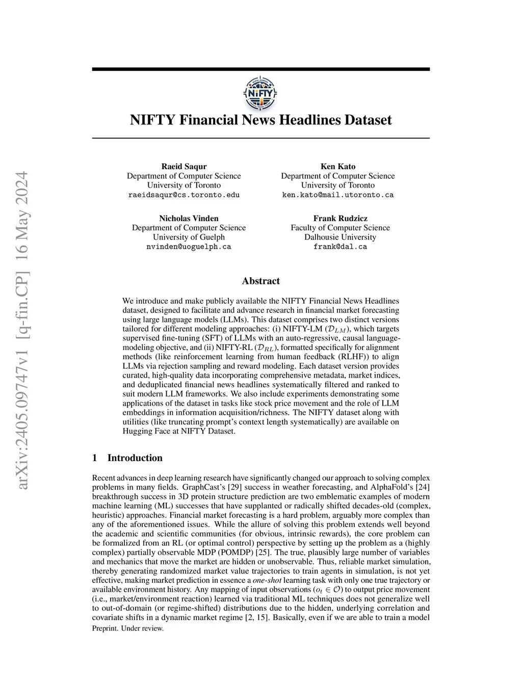 We introduce and make publicly available the NIFTY Financial News Headlines dataset, designed to facilitate and advance research in financial market forecasting using large language models (LLMs). This dataset comprises two distinct versions tailored for different modeling approaches: (i) NIFTY-LM, which targets supervised fine-tuning (SFT) of LLMs with an auto-regressive, causal language-modeling objective, and (ii) NIFTY-RL, formatted specifically for alignment methods (like reinforcement learning from human feedback (RLHF)) to align LLMs via rejection sampling and reward modeling. Each dataset version provides curated, high-quality data incorporating comprehensive metadata, market indices, and deduplicated financial news headlines systematically filtered and ranked to suit modern LLM frameworks. We also include experiments demonstrating some applications of the dataset in tasks like stock price movement and the role of LLM embeddings in information acquisition/richness. The NIFTY dataset along with utilities (like truncating prompt's context length systematically) are available on Hugging Face at https://huggingface.co/datasets/raeidsaqur/NIFTY.