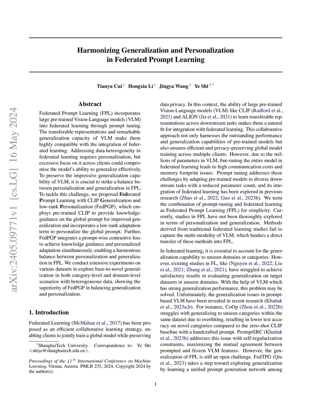 Federated Prompt Learning (FPL) incorporates large pre-trained Vision-Language models (VLM) into federated learning through prompt tuning. The transferable representations and remarkable generalization capacity of VLM make them highly compatible with the integration of federated learning. Addressing data heterogeneity in federated learning requires personalization, but excessive focus on it across clients could compromise the model's ability to generalize effectively. To preserve the impressive generalization capability of VLM, it is crucial to strike a balance between personalization and generalization in FPL. To tackle this challenge, we proposed Federated Prompt Learning with CLIP Generalization and low-rank Personalization (FedPGP), which employs pre-trained CLIP to provide knowledge-guidance on the global prompt for improved generalization and incorporates a low-rank adaptation term to personalize the global prompt. Further, FedPGP integrates a prompt-wise contrastive loss to achieve knowledge guidance and personalized adaptation simultaneously, enabling a harmonious balance between personalization and generalization in FPL. We conduct extensive experiments on various datasets to explore base-to-novel generalization in both category-level and domain-level scenarios with heterogeneous data, showing the superiority of FedPGP in balancing generalization and personalization.
