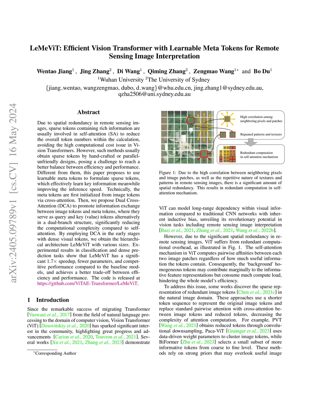 Due to spatial redundancy in remote sensing images, sparse tokens containing rich information are usually involved in self-attention (SA) to reduce the overall token numbers within the calculation, avoiding the high computational cost issue in Vision Transformers. However, such methods usually obtain sparse tokens by hand-crafted or parallel-unfriendly designs, posing a challenge to reach a better balance between efficiency and performance. Different from them, this paper proposes to use learnable meta tokens to formulate sparse tokens, which effectively learn key information meanwhile improving the inference speed. Technically, the meta tokens are first initialized from image tokens via cross-attention. Then, we propose Dual Cross-Attention (DCA) to promote information exchange between image tokens and meta tokens, where they serve as query and key (value) tokens alternatively in a dual-branch structure, significantly reducing the computational complexity compared to self-attention. By employing DCA in the early stages with dense visual tokens, we obtain the hierarchical architecture LeMeViT with various sizes. Experimental results in classification and dense prediction tasks show that LeMeViT has a significant speedup, fewer parameters, and competitive performance compared to the baseline models, and achieves a better trade-off between efficiency and performance.