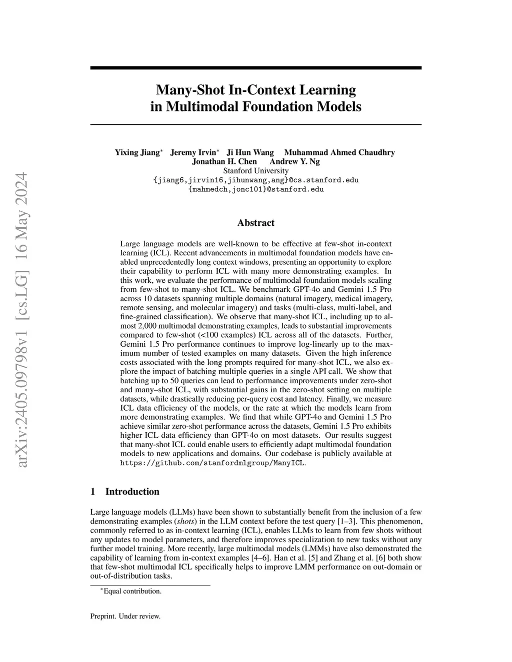 Large language models are well-known to be effective at few-shot in-context learning (ICL). Recent advancements in multimodal foundation models have enabled unprecedentedly long context windows, presenting an opportunity to explore their capability to perform ICL with many more demonstrating examples. In this work, we evaluate the performance of multimodal foundation models scaling from few-shot to many-shot ICL. We benchmark GPT-4o and Gemini 1.5 Pro across 10 datasets spanning multiple domains (natural imagery, medical imagery, remote sensing, and molecular imagery) and tasks (multi-class, multi-label, and fine-grained classification). We observe that many-shot ICL, including up to almost 2,000 multimodal demonstrating examples, leads to substantial improvements compared to few-shot (<100 examples) ICL across all of the datasets. Further, Gemini 1.5 Pro performance continues to improve log-linearly up to the maximum number of tested examples on many datasets. Given the high inference costs associated with the long prompts required for many-shot ICL, we also explore the impact of batching multiple queries in a single API call. We show that batching up to 50 queries can lead to performance improvements under zero-shot and many-shot ICL, with substantial gains in the zero-shot setting on multiple datasets, while drastically reducing per-query cost and latency. Finally, we measure ICL data efficiency of the models, or the rate at which the models learn from more demonstrating examples. We find that while GPT-4o and Gemini 1.5 Pro achieve similar zero-shot performance across the datasets, Gemini 1.5 Pro exhibits higher ICL data efficiency than GPT-4o on most datasets. Our results suggest that many-shot ICL could enable users to efficiently adapt multimodal foundation models to new applications and domains. Our codebase is publicly available at https://github.com/stanfordmlgroup/ManyICL .