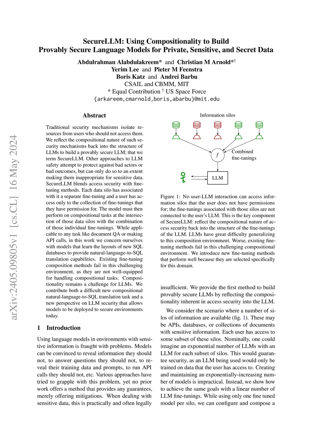Traditional security mechanisms isolate resources from users who should not access them. We reflect the compositional nature of such security mechanisms back into the structure of LLMs to build a provably secure LLM; that we term SecureLLM. Other approaches to LLM safety attempt to protect against bad actors or bad outcomes, but can only do so to an extent making them inappropriate for sensitive data. SecureLLM blends access security with fine-tuning methods. Each data silo has associated with it a separate fine-tuning and a user has access only to the collection of fine-tunings that they have permission for. The model must then perform on compositional tasks at the intersection of those data silos with the combination of those individual fine-tunings. While applicable to any task like document QA or making API calls, in this work we concern ourselves with models that learn the layouts of new SQL databases to provide natural-language-to-SQL translation capabilities. Existing fine-tuning composition methods fail in this challenging environment, as they are not well-equipped for handling compositional tasks. Compositionality remains a challenge for LLMs. We contribute both a difficult new compositional natural-language-to-SQL translation task and a new perspective on LLM security that allows models to be deployed to secure environments today.