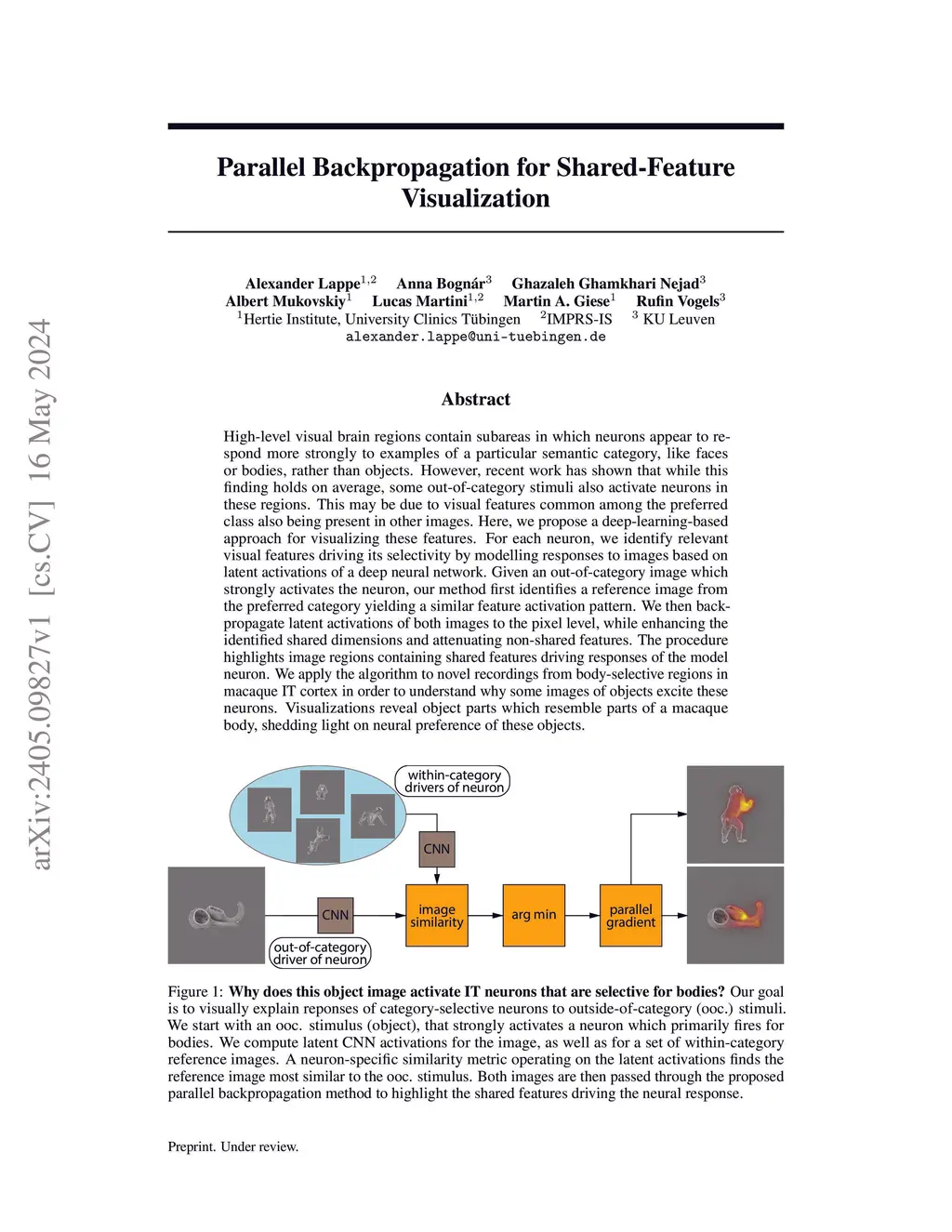 High-level visual brain regions contain subareas in which neurons appear to respond more strongly to examples of a particular semantic category, like faces or bodies, rather than objects. However, recent work has shown that while this finding holds on average, some out-of-category stimuli also activate neurons in these regions. This may be due to visual features common among the preferred class also being present in other images. Here, we propose a deep-learning-based approach for visualizing these features. For each neuron, we identify relevant visual features driving its selectivity by modelling responses to images based on latent activations of a deep neural network. Given an out-of-category image which strongly activates the neuron, our method first identifies a reference image from the preferred category yielding a similar feature activation pattern. We then backpropagate latent activations of both images to the pixel level, while enhancing the identified shared dimensions and attenuating non-shared features. The procedure highlights image regions containing shared features driving responses of the model neuron. We apply the algorithm to novel recordings from body-selective regions in macaque IT cortex in order to understand why some images of objects excite these neurons. Visualizations reveal object parts which resemble parts of a macaque body, shedding light on neural preference of these objects.