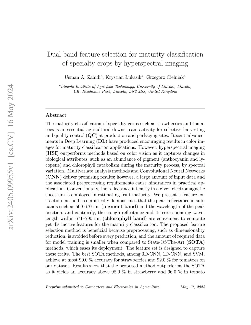 Dual-band feature selection for maturity classification of specialty
