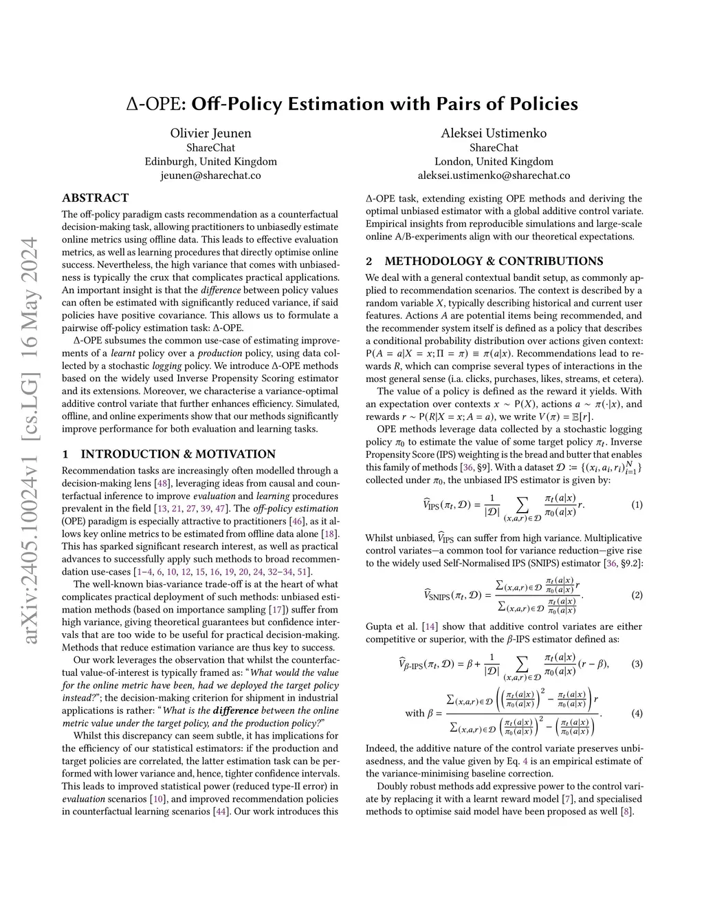 The off-policy paradigm casts recommendation as a counterfactual decision-making task, allowing practitioners to unbiasedly estimate online metrics using offline data. This leads to effective evaluation metrics, as well as learning procedures that directly optimise online success. Nevertheless, the high variance that comes with unbiasedness is typically the crux that complicates practical applications. An important insight is that the difference between policy values can often be estimated with significantly reduced variance, if said policies have positive covariance. This allows us to formulate a pairwise off-policy estimation task: . subsumes the common use-case of estimating improvements of a learnt policy over a production policy, using data collected by a stochastic logging policy. We introduce methods based on the widely used Inverse Propensity Scoring estimator and its extensions. Moreover, we characterise a variance-optimal additive control variate that further enhances efficiency. Simulated, offline, and online experiments show that our methods significantly improve performance for both evaluation and learning tasks.