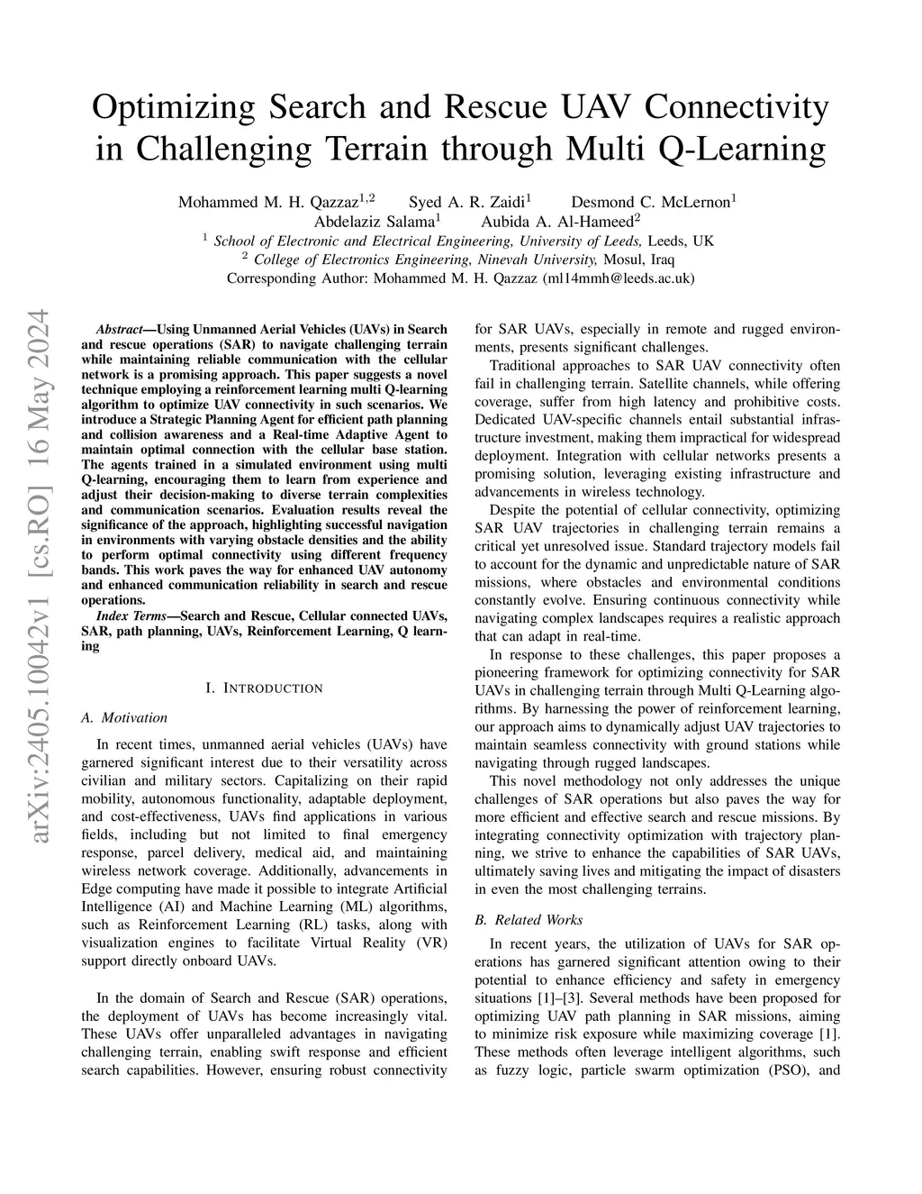 Using Unmanned Aerial Vehicles (UAVs) in Search and rescue operations (SAR) to navigate challenging terrain while maintaining reliable communication with the cellular network is a promising approach. This paper suggests a novel technique employing a reinforcement learning multi Q-learning algorithm to optimize UAV connectivity in such scenarios. We introduce a Strategic Planning Agent for efficient path planning and collision awareness and a Real-time Adaptive Agent to maintain optimal connection with the cellular base station. The agents trained in a simulated environment using multi Q-learning, encouraging them to learn from experience and adjust their decision-making to diverse terrain complexities and communication scenarios. Evaluation results reveal the significance of the approach, highlighting successful navigation in environments with varying obstacle densities and the ability to perform optimal connectivity using different frequency bands. This work paves the way for enhanced UAV autonomy and enhanced communication reliability in search and rescue operations.