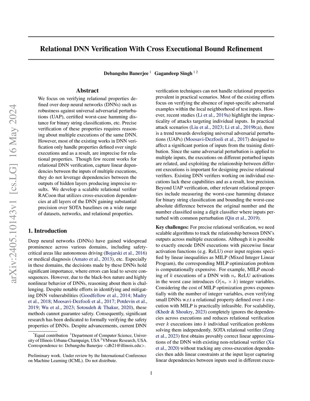 We focus on verifying relational properties defined over deep neural networks (DNNs) such as robustness against universal adversarial perturbations (UAP), certified worst-case hamming distance for binary string classifications, etc. Precise verification of these properties requires reasoning about multiple executions of the same DNN. However, most of the existing works in DNN verification only handle properties defined over single executions and as a result, are imprecise for relational properties. Though few recent works for relational DNN verification, capture linear dependencies between the inputs of multiple executions, they do not leverage dependencies between the outputs of hidden layers producing imprecise results. We develop a scalable relational verifier RACoon that utilizes cross-execution dependencies at all layers of the DNN gaining substantial precision over SOTA baselines on a wide range of datasets, networks, and relational properties.