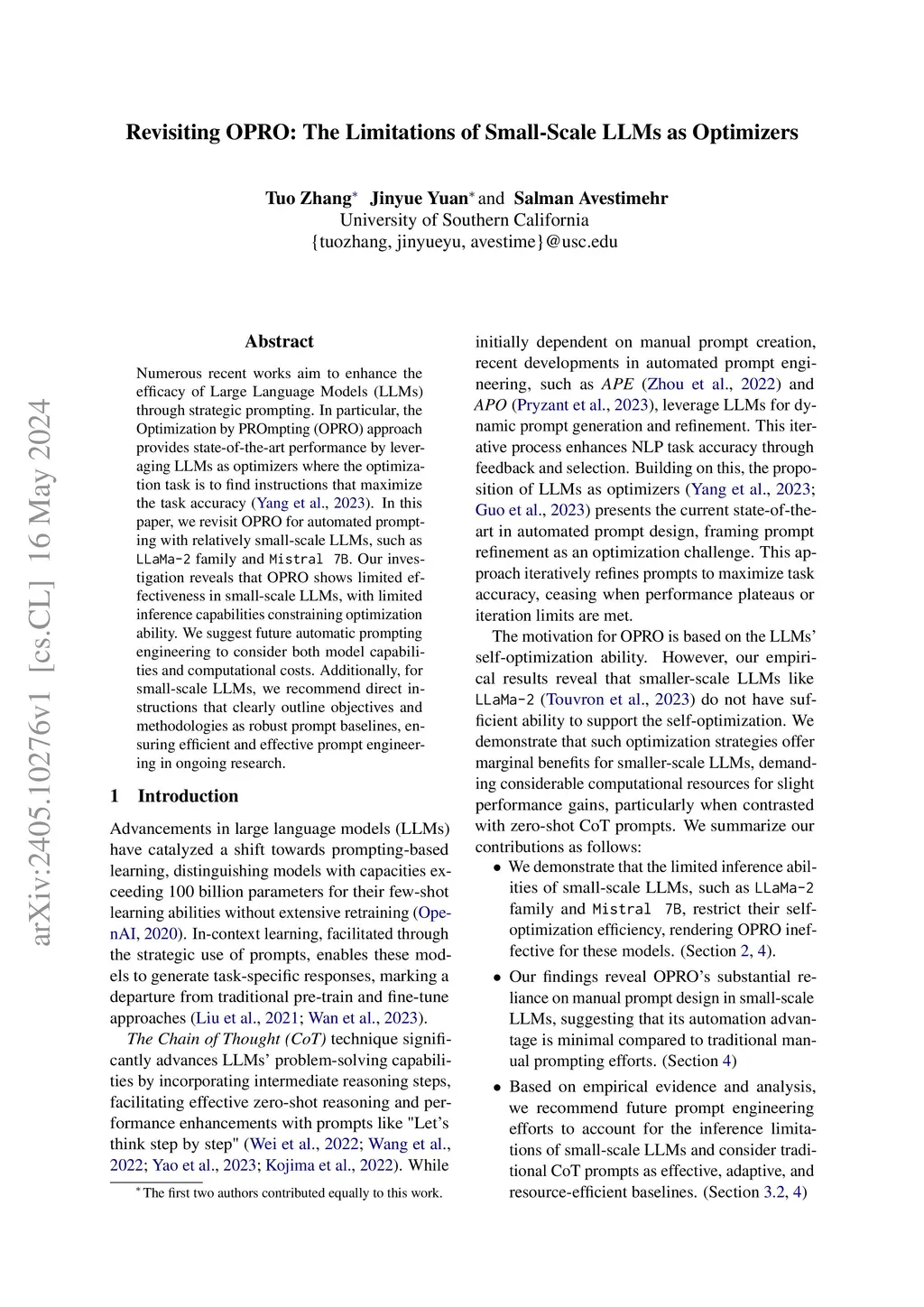 Numerous recent works aim to enhance the efficacy of Large Language Models (LLMs) through strategic prompting. In particular, the Optimization by PROmpting (OPRO) approach provides state-of-the-art performance by leveraging LLMs as optimizers where the optimization task is to find instructions that maximize the task accuracy. In this paper, we revisit OPRO for automated prompting with relatively small-scale LLMs, such as LLaMa-2 family and Mistral 7B. Our investigation reveals that OPRO shows limited effectiveness in small-scale LLMs, with limited inference capabilities constraining optimization ability. We suggest future automatic prompting engineering to consider both model capabilities and computational costs. Additionally, for small-scale LLMs, we recommend direct instructions that clearly outline objectives and methodologies as robust prompt baselines, ensuring efficient and effective prompt engineering in ongoing research.
