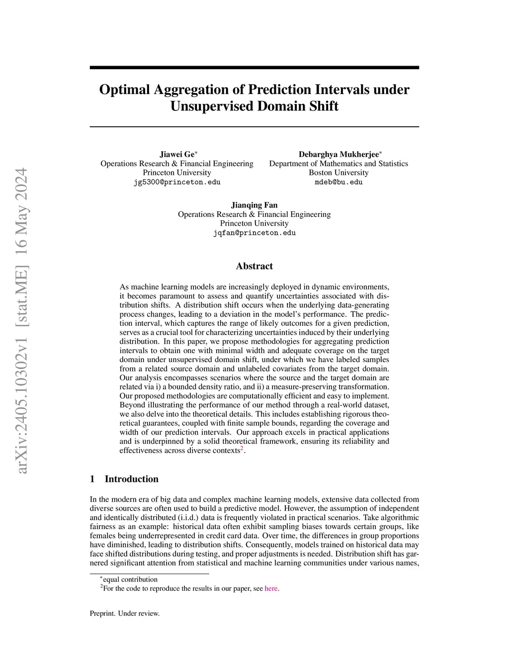 As machine learning models are increasingly deployed in dynamic environments, it becomes paramount to assess and quantify uncertainties associated with distribution shifts. A distribution shift occurs when the underlying data-generating process changes, leading to a deviation in the model's performance. The prediction interval, which captures the range of likely outcomes for a given prediction, serves as a crucial tool for characterizing uncertainties induced by their underlying distribution. In this paper, we propose methodologies for aggregating prediction intervals to obtain one with minimal width and adequate coverage on the target domain under unsupervised domain shift, under which we have labeled samples from a related source domain and unlabeled covariates from the target domain. Our analysis encompasses scenarios where the source and the target domain are related via i) a bounded density ratio, and ii) a measure-preserving transformation. Our proposed methodologies are computationally efficient and easy to implement. Beyond illustrating the performance of our method through a real-world dataset, we also delve into the theoretical details. This includes establishing rigorous theoretical guarantees, coupled with finite sample bounds, regarding the coverage and width of our prediction intervals. Our approach excels in practical applications and is underpinned by a solid theoretical framework, ensuring its reliability and effectiveness across diverse contexts.
