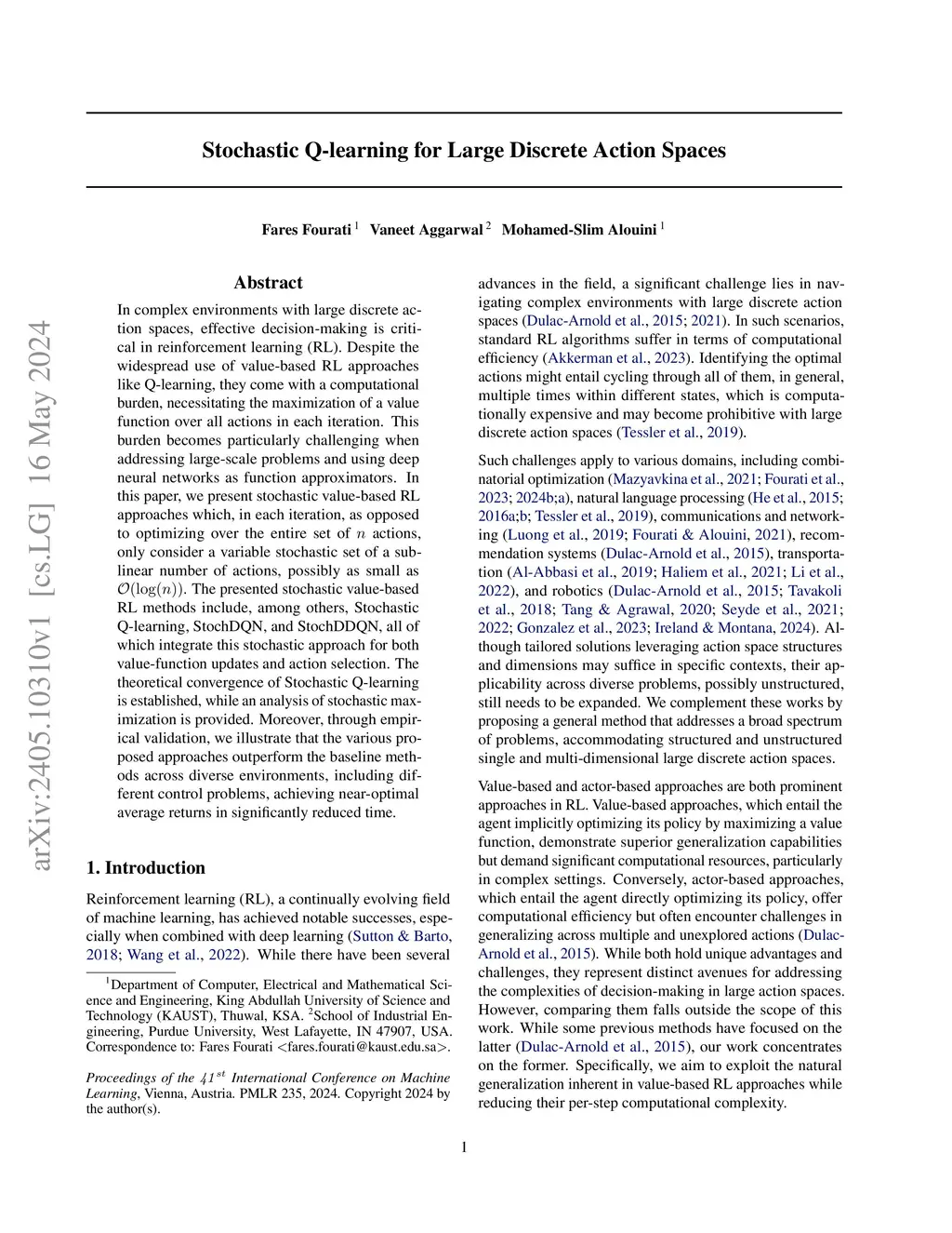 In complex environments with large discrete action spaces, effective decision-making is critical in reinforcement learning (RL). Despite the widespread use of value-based RL approaches like Q-learning, they come with a computational burden, necessitating the maximization of a value function over all actions in each iteration. This burden becomes particularly challenging when addressing large-scale problems and using deep neural networks as function approximators. In this paper, we present stochastic value-based RL approaches which, in each iteration, as opposed to optimizing over the entire set of actions, only consider a variable stochastic set of a sublinear number of actions, possibly as small as . The presented stochastic value-based RL methods include, among others, Stochastic Q-learning, StochDQN, and StochDDQN, all of which integrate this stochastic approach for both value-function updates and action selection. The theoretical convergence of Stochastic Q-learning is established, while an analysis of stochastic maximization is provided. Moreover, through empirical validation, we illustrate that the various proposed approaches outperform the baseline methods across diverse environments, including different control problems, achieving near-optimal average returns in significantly reduced time.