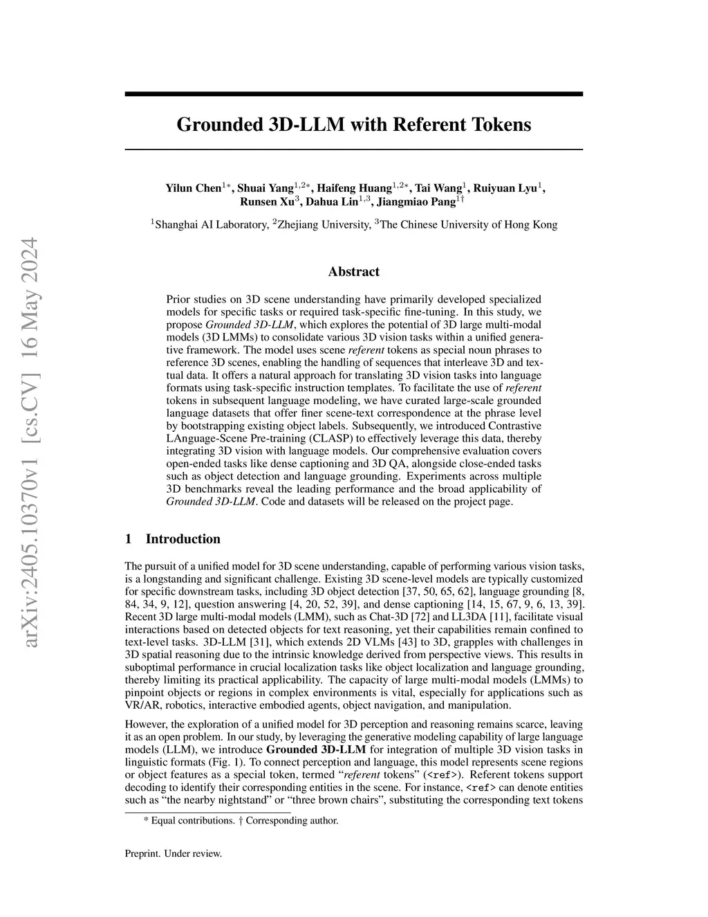 Prior studies on 3D scene understanding have primarily developed specialized models for specific tasks or required task-specific fine-tuning. In this study, we propose Grounded 3D-LLM, which explores the potential of 3D large multi-modal models (3D LMMs) to consolidate various 3D vision tasks within a unified generative framework. The model uses scene referent tokens as special noun phrases to reference 3D scenes, enabling the handling of sequences that interleave 3D and textual data. It offers a natural approach for translating 3D vision tasks into language formats using task-specific instruction templates. To facilitate the use of referent tokens in subsequent language modeling, we have curated large-scale grounded language datasets that offer finer scene-text correspondence at the phrase level by bootstrapping existing object labels. Subsequently, we introduced Contrastive LAnguage-Scene Pre-training (CLASP) to effectively leverage this data, thereby integrating 3D vision with language models. Our comprehensive evaluation covers open-ended tasks like dense captioning and 3D QA, alongside close-ended tasks such as object detection and language grounding. Experiments across multiple 3D benchmarks reveal the leading performance and the broad applicability of Grounded 3D-LLM. Code and datasets will be released on the project page: https://groundedscenellm.github.io/grounded_3d-llm.github.io.