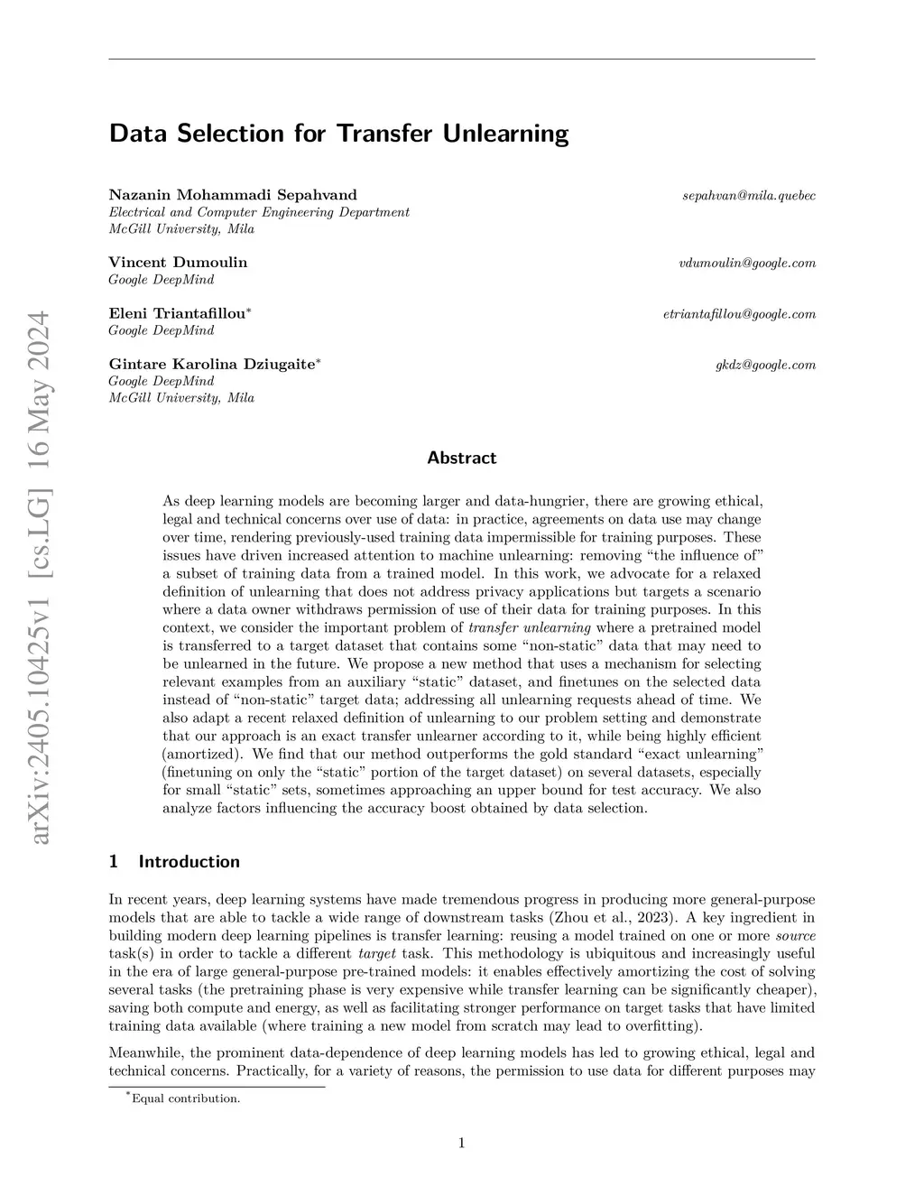 As deep learning models are becoming larger and data-hungrier, there are growing ethical, legal and technical concerns over use of data: in practice, agreements on data use may change over time, rendering previously-used training data impermissible for training purposes. These issues have driven increased attention to machine unlearning: removing "the influence of" a subset of training data from a trained model. In this work, we advocate for a relaxed definition of unlearning that does not address privacy applications but targets a scenario where a data owner withdraws permission of use of their data for training purposes. In this context, we consider the important problem of \emph{transfer unlearning} where a pretrained model is transferred to a target dataset that contains some "non-static" data that may need to be unlearned in the future. We propose a new method that uses a mechanism for selecting relevant examples from an auxiliary "static" dataset, and finetunes on the selected data instead of "non-static" target data; addressing all unlearning requests ahead of time. We also adapt a recent relaxed definition of unlearning to our problem setting and demonstrate that our approach is an exact transfer unlearner according to it, while being highly efficient (amortized). We find that our method outperforms the gold standard "exact unlearning" (finetuning on only the "static" portion of the target dataset) on several datasets, especially for small "static" sets, sometimes approaching an upper bound for test accuracy. We also analyze factors influencing the accuracy boost obtained by data selection.