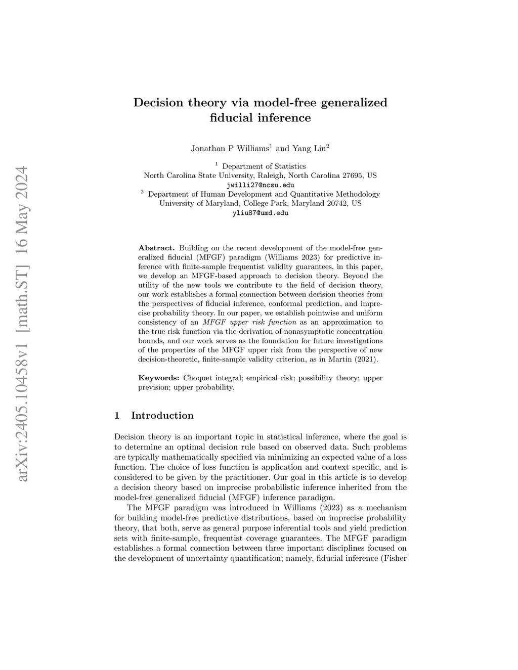 Building on the recent development of the model-free generalized fiducial (MFGF) paradigm (Williams, 2023) for predictive inference with finite-sample frequentist validity guarantees, in this paper, we develop an MFGF-based approach to decision theory. Beyond the utility of the new tools we contribute to the field of decision theory, our work establishes a formal connection between decision theories from the perspectives of fiducial inference, conformal prediction, and imprecise probability theory. In our paper, we establish pointwise and uniform consistency of an {\em MFGF upper risk function} as an approximation to the true risk function via the derivation of nonasymptotic concentration bounds, and our work serves as the foundation for future investigations of the properties of the MFGF upper risk from the perspective of new decision-theoretic, finite-sample validity criterion, as in Martin (2021).